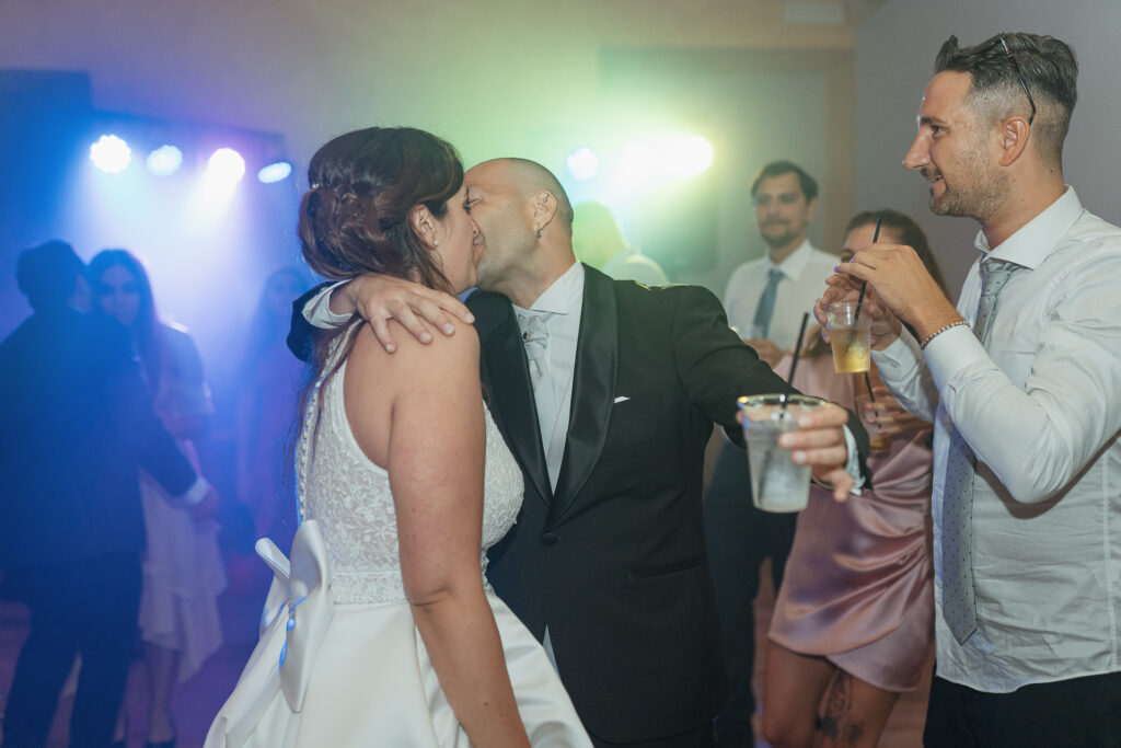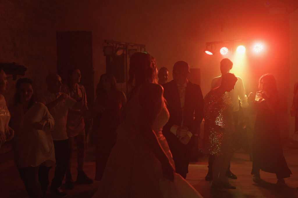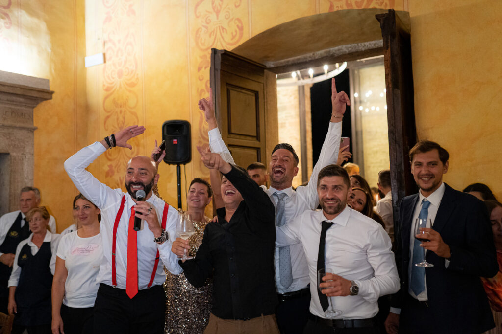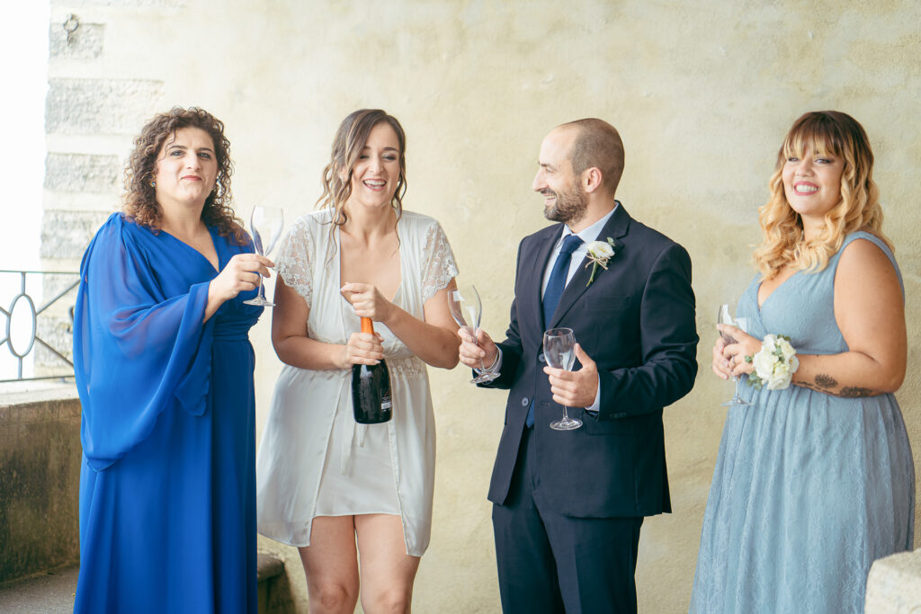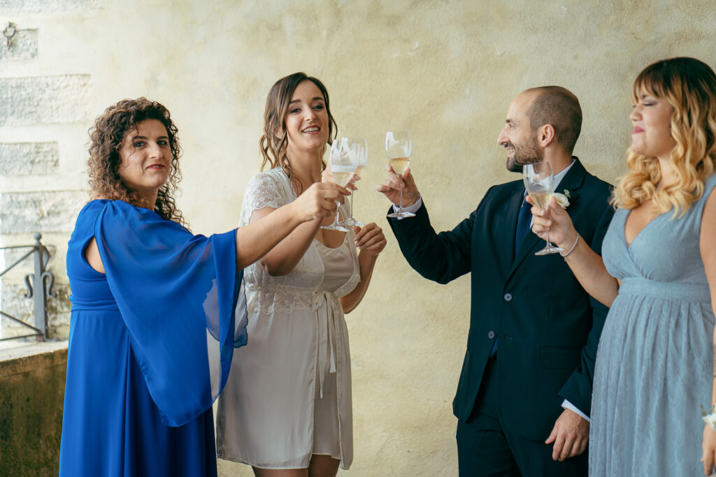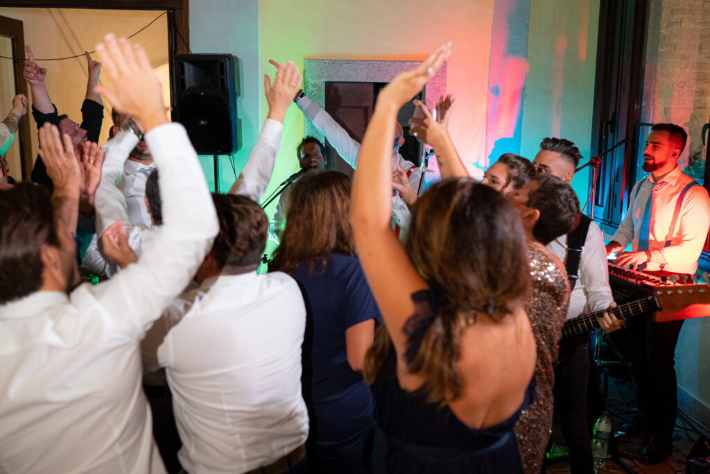From the clearing in the wooded area, the guests moved to the courtyard for a welcome drink and snacks. Here a local band started playing live Italian classics and the wedding was in full swing.