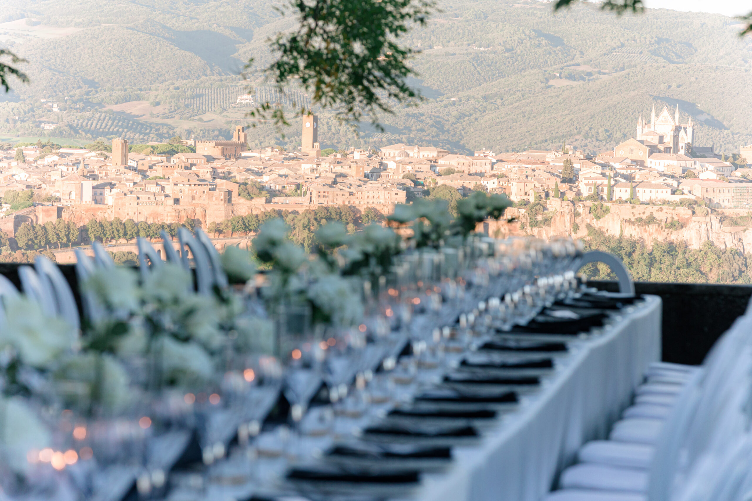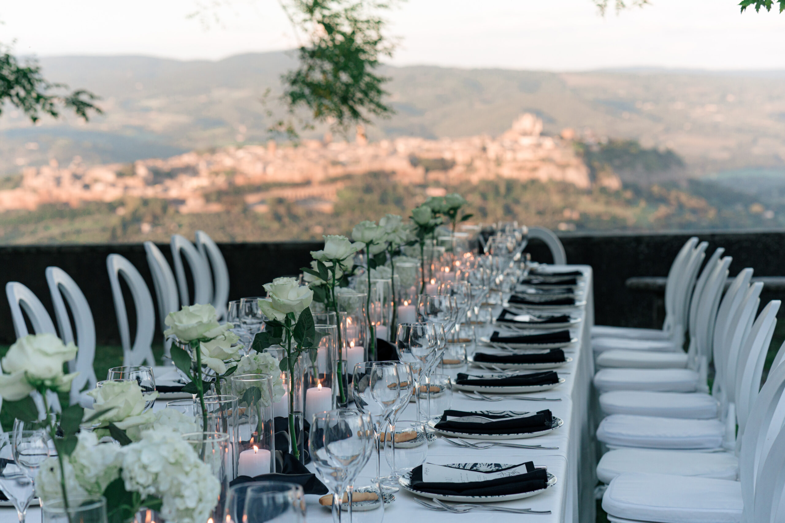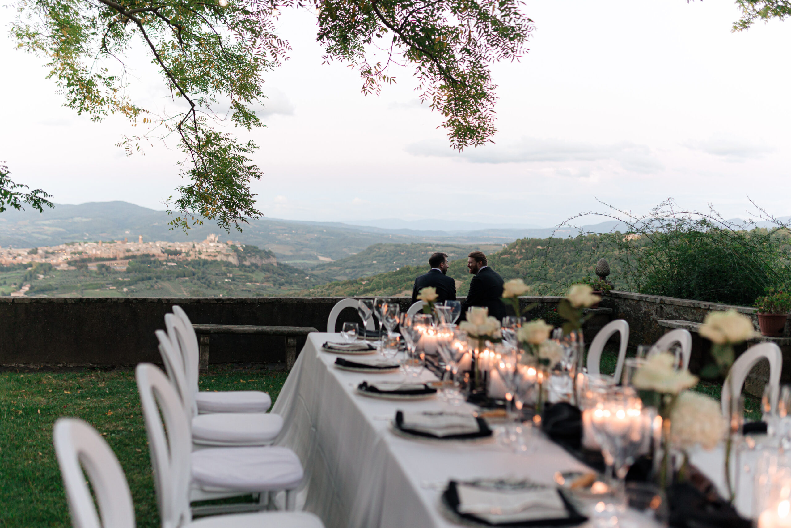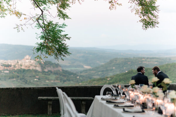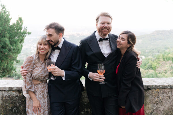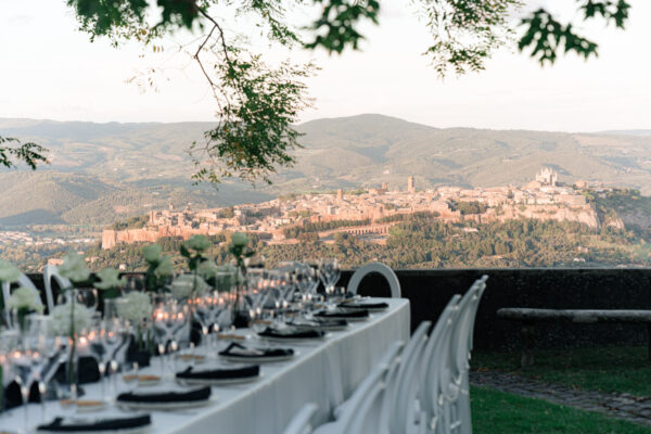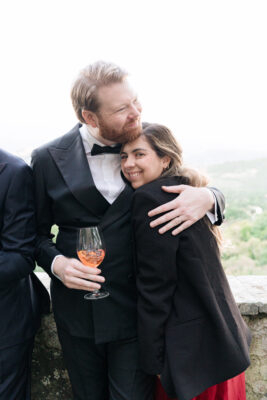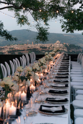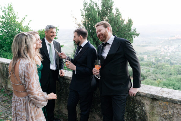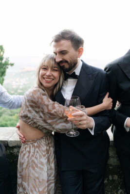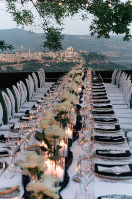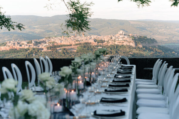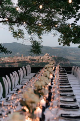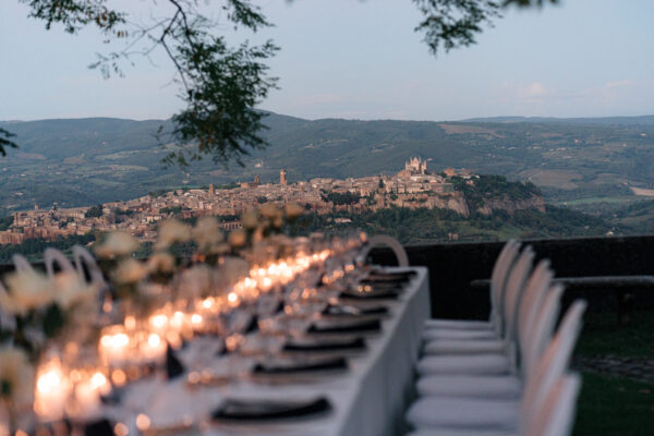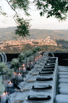 The ceremony was held outdoors beneath ancient trees, overlooking rolling landscapes that seemed to stretch endlessly. Guests enjoyed the scent of rosemary and lavender carried by a soft breeze, while the couple exchanged their vows in front of a panoramic view that only Umbria can offer.