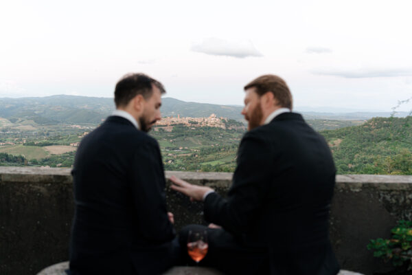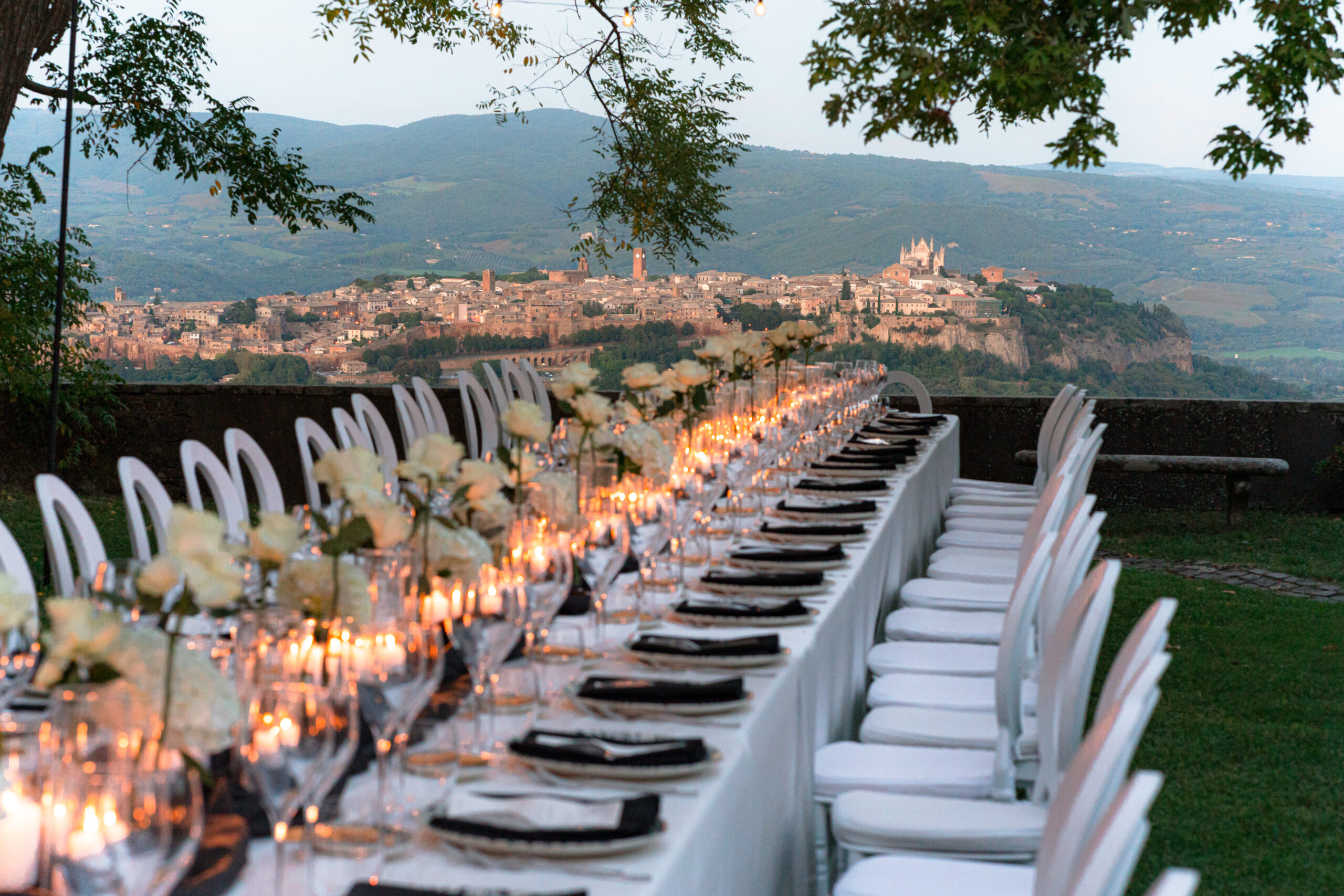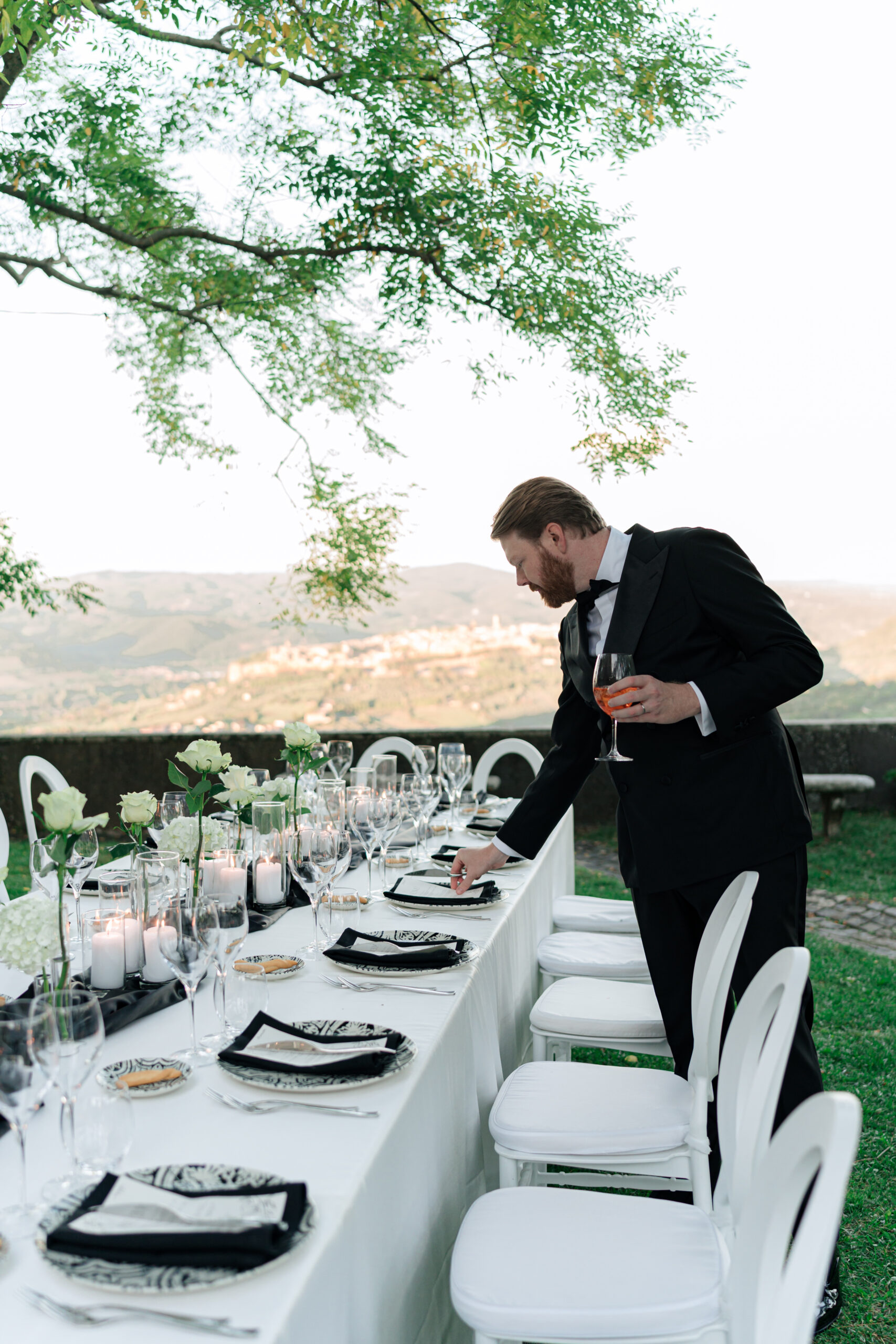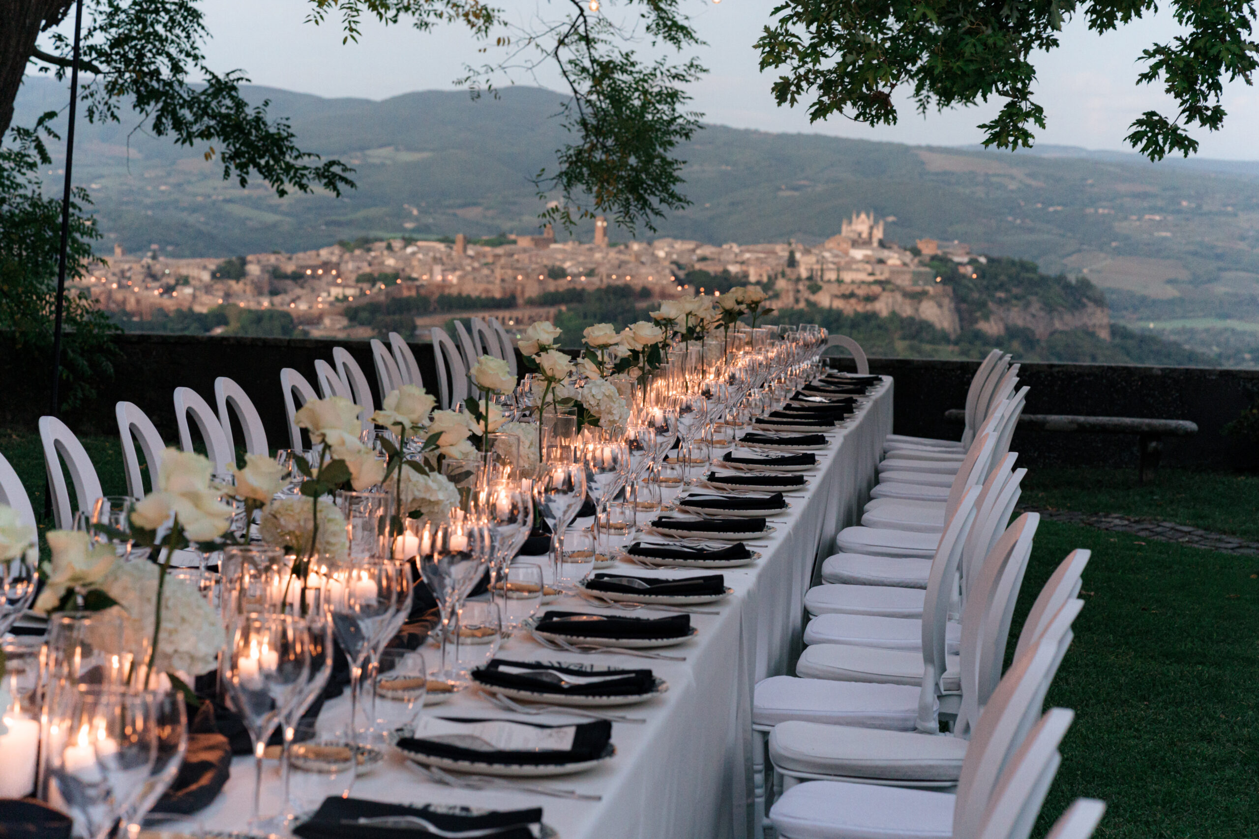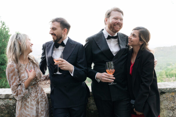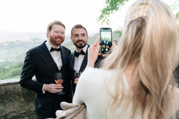 The ceremony was held outdoors beneath ancient trees, overlooking rolling landscapes that seemed to stretch endlessly. Guests enjoyed the scent of rosemary and lavender carried by a soft breeze, while the couple exchanged their vows in front of a panoramic view that only Umbria can offer.
