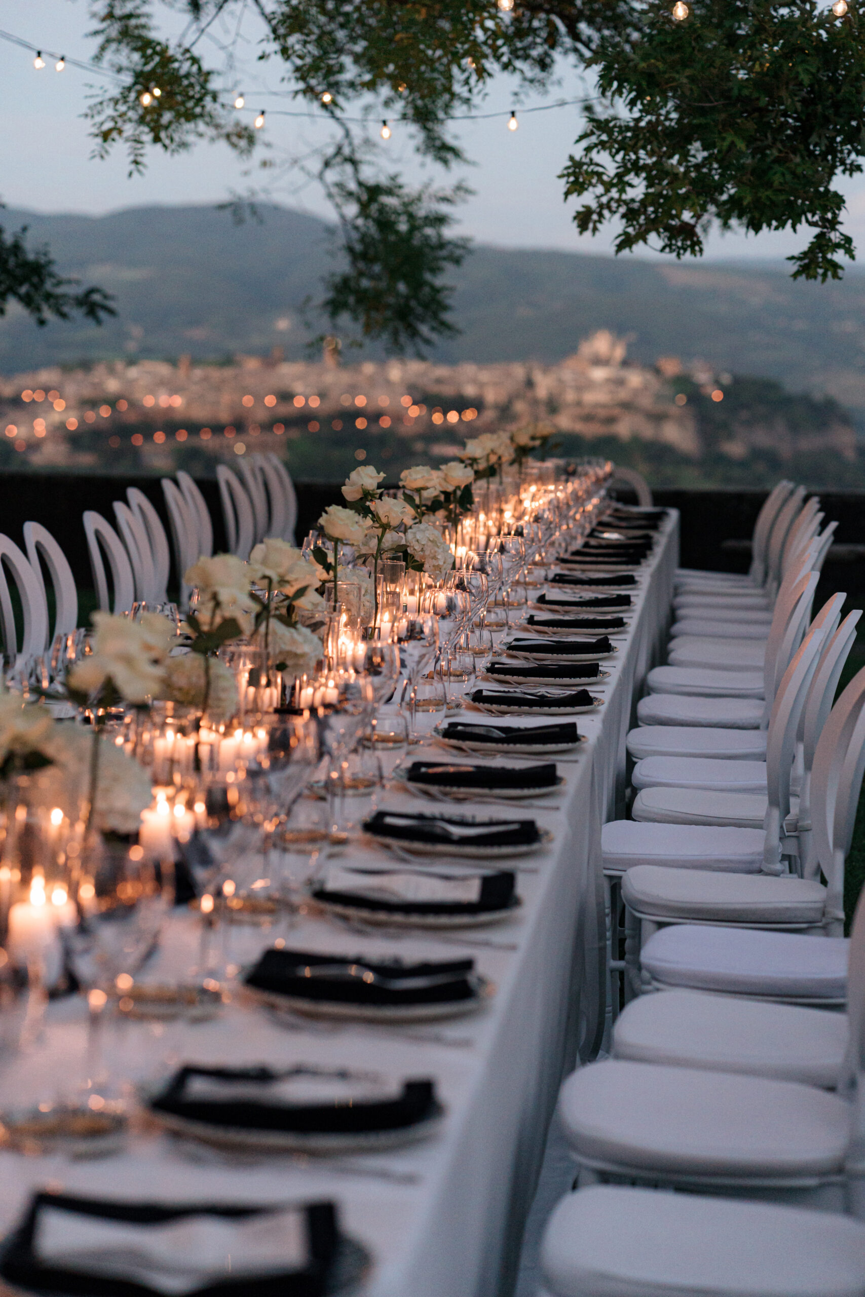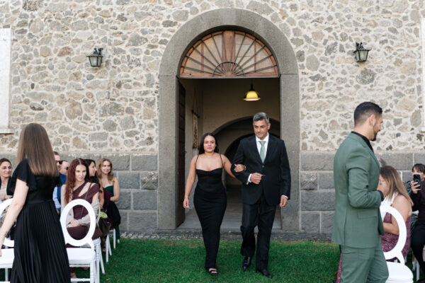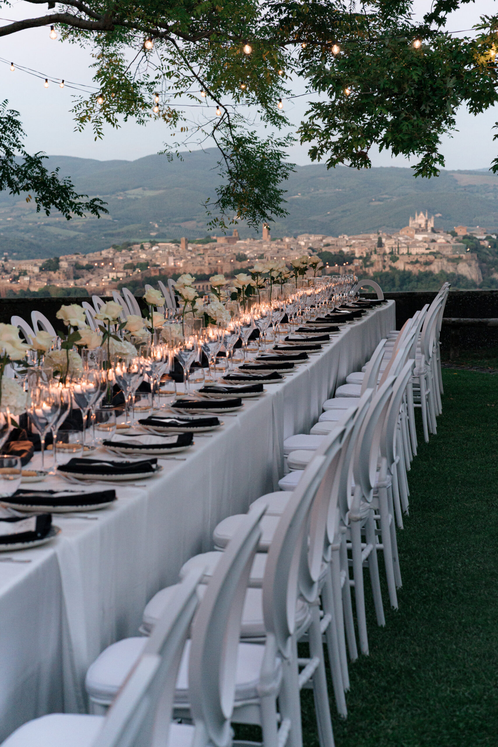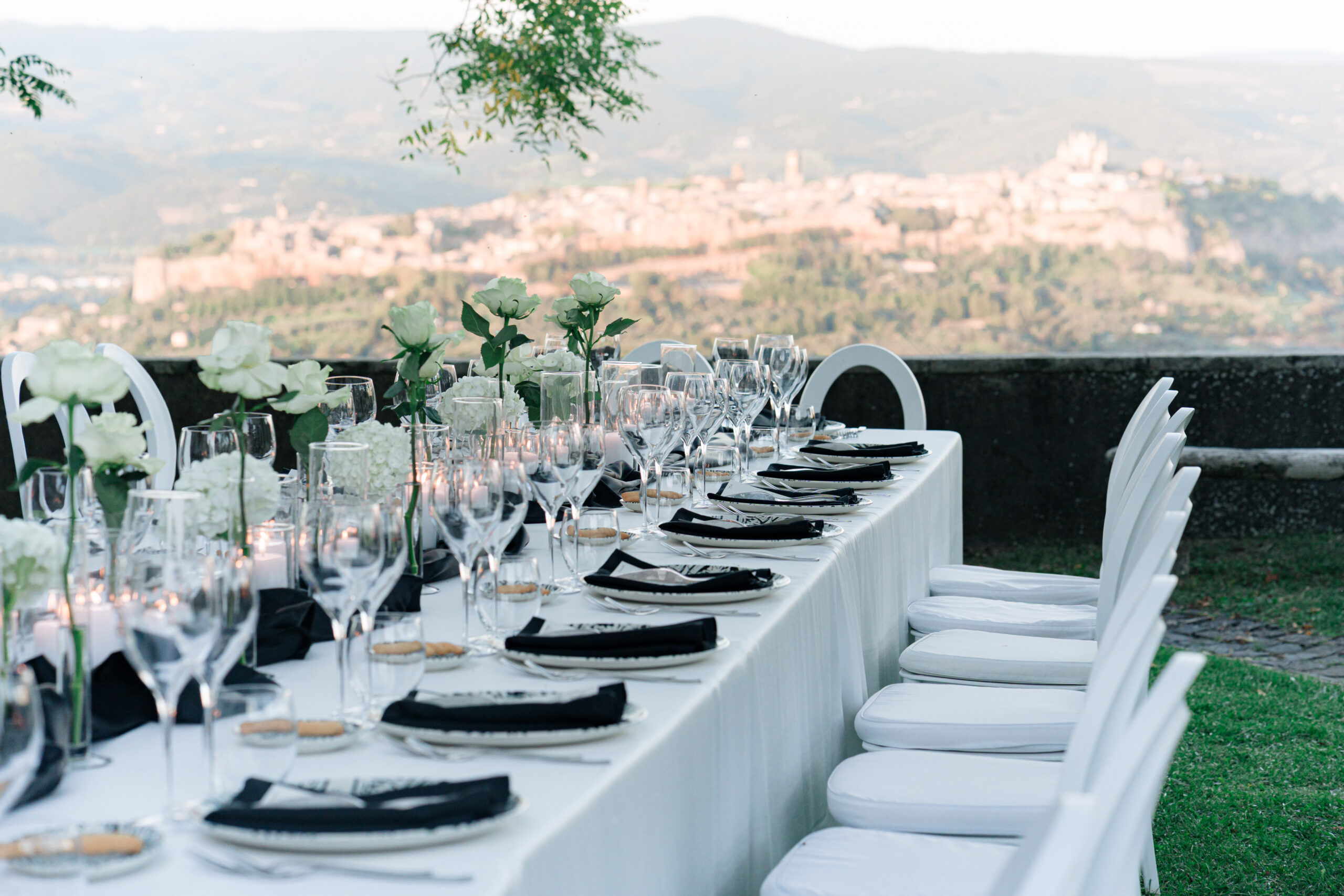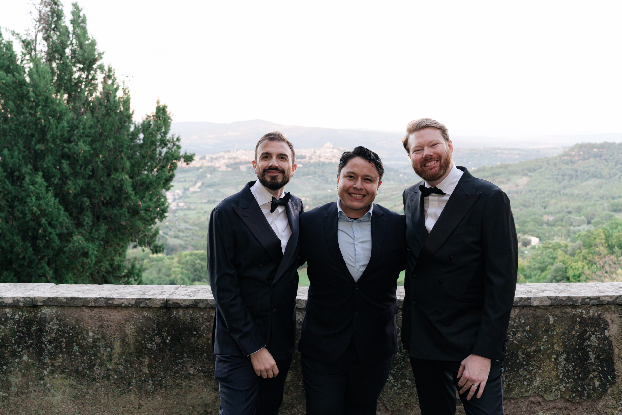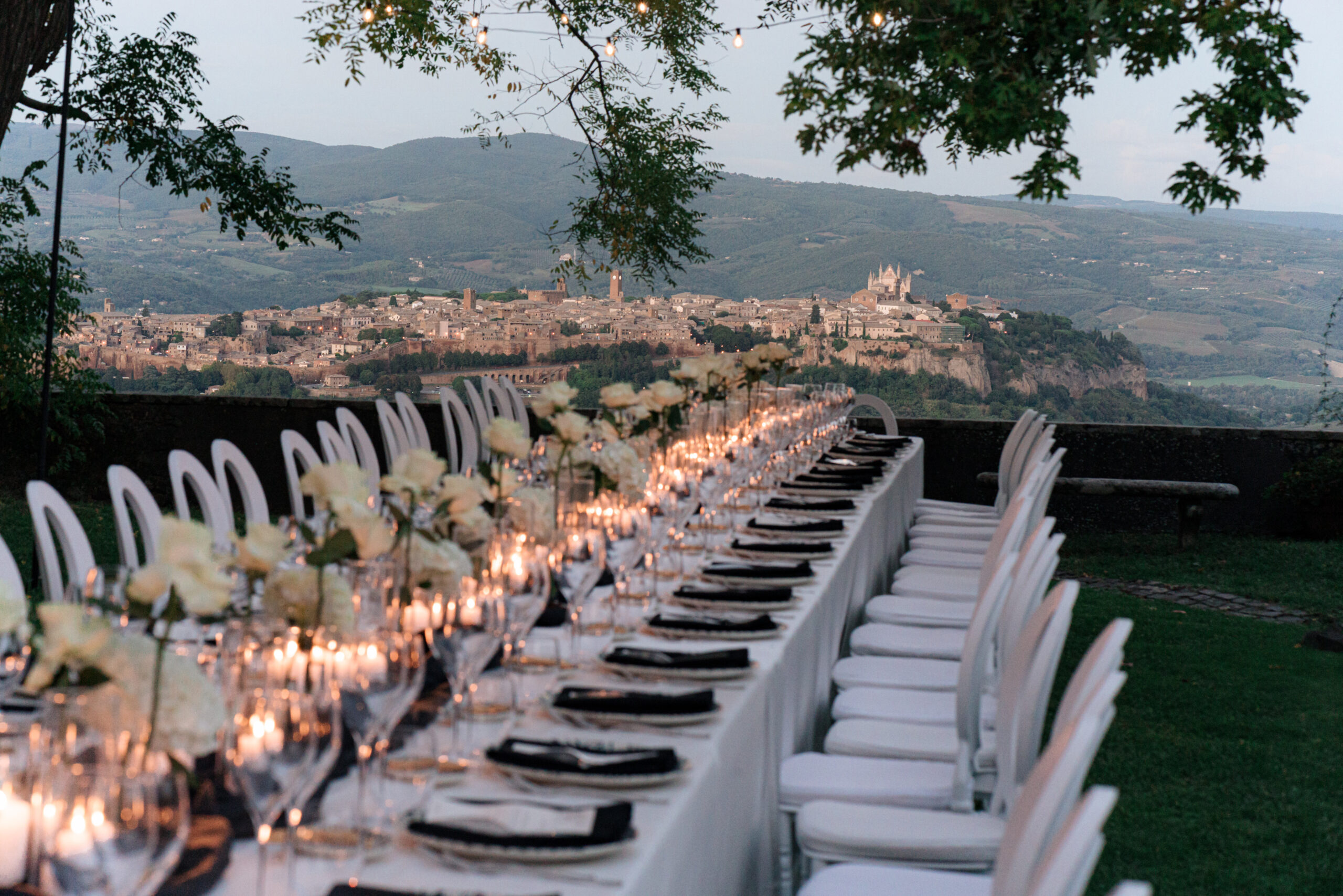 The ceremony was held outdoors beneath ancient trees, overlooking rolling landscapes that seemed to stretch endlessly. Guests enjoyed the scent of rosemary and lavender carried by a soft breeze, while the couple exchanged their vows in front of a panoramic view that only Umbria can offer.