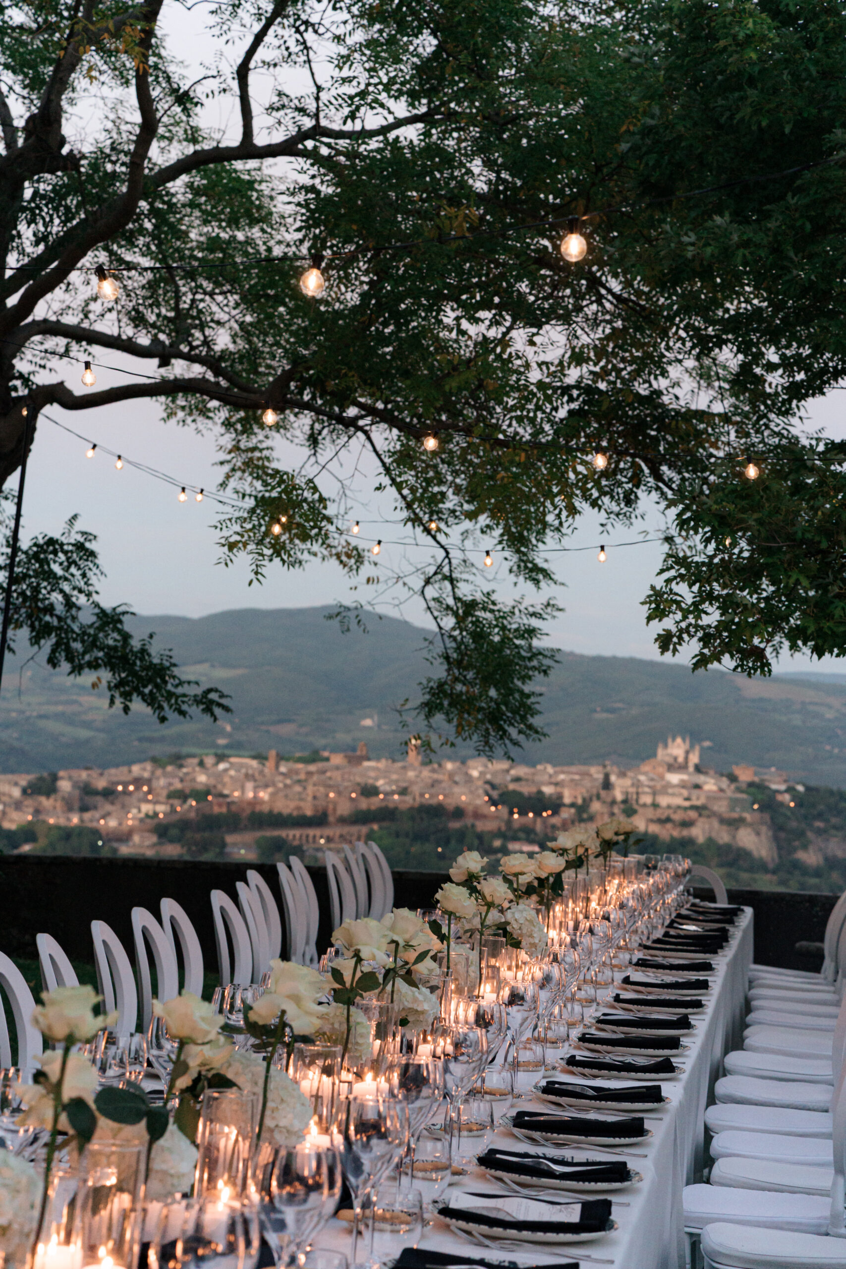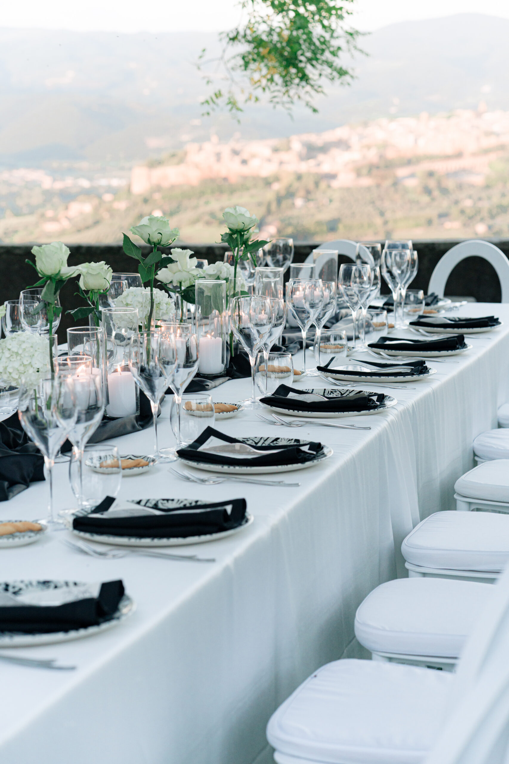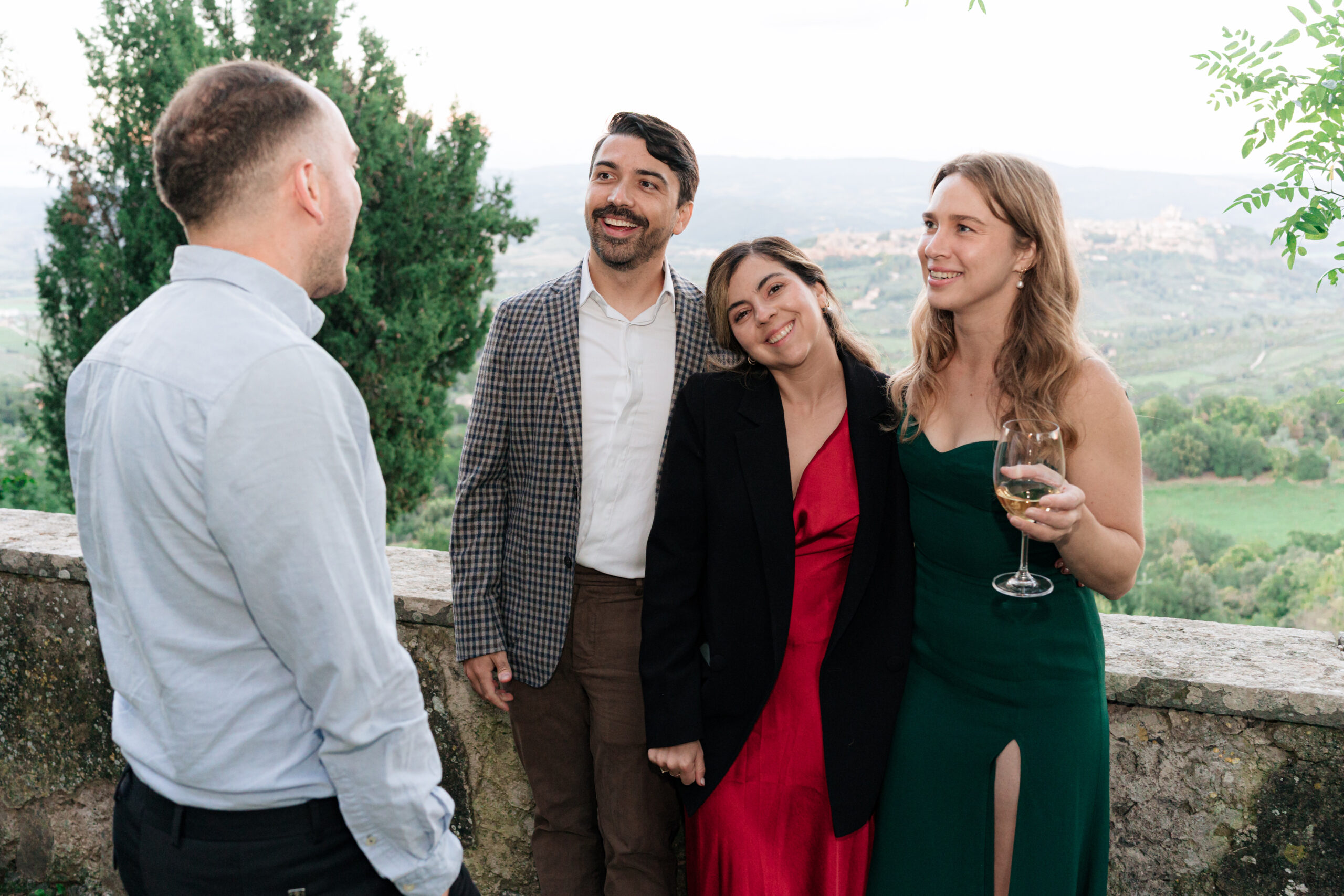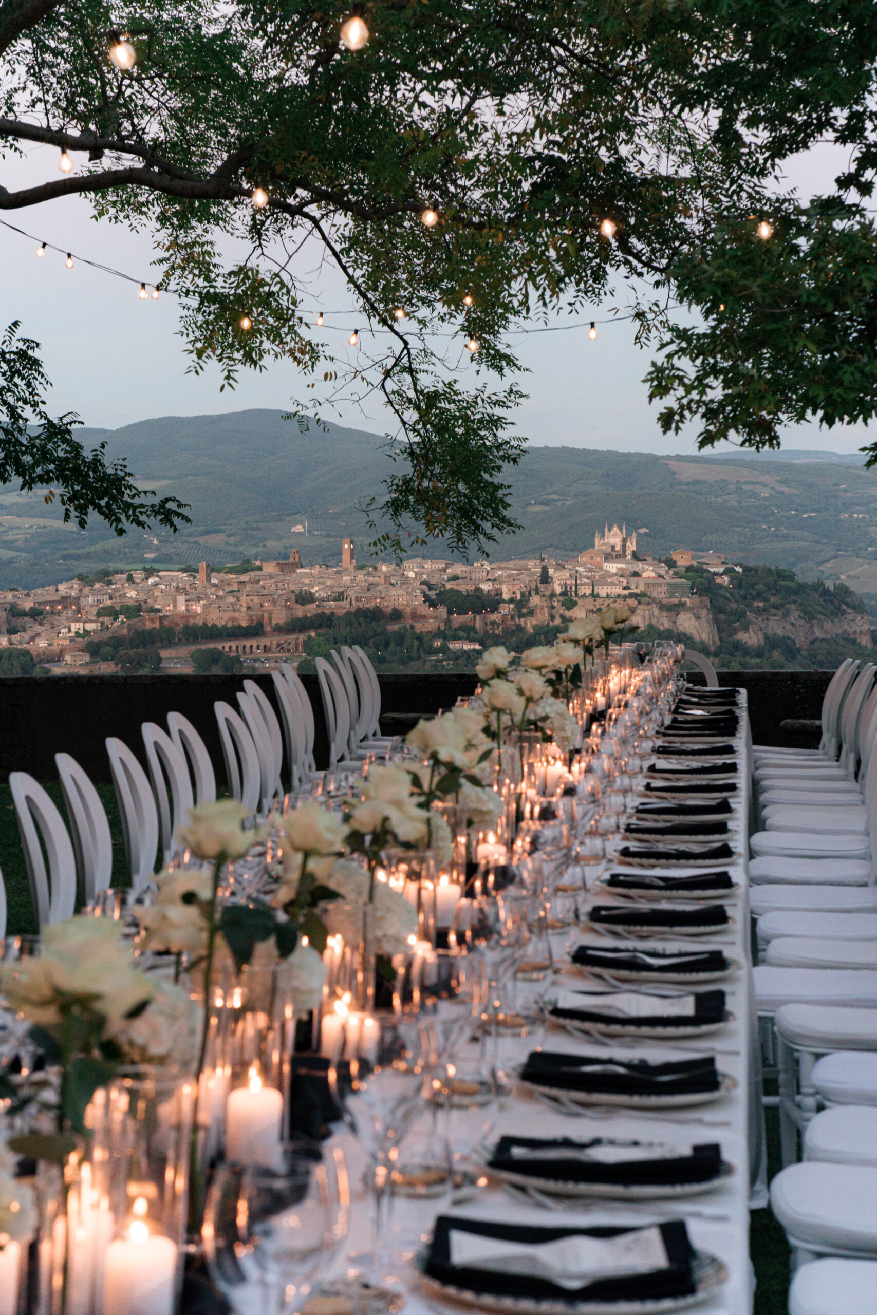 The ceremony was held outdoors beneath ancient trees, overlooking rolling landscapes that seemed to stretch endlessly. Guests enjoyed the scent of rosemary and lavender carried by a soft breeze, while the couple exchanged their vows in front of a panoramic view that only Umbria can offer.