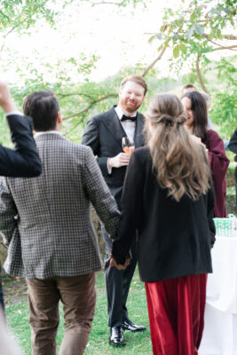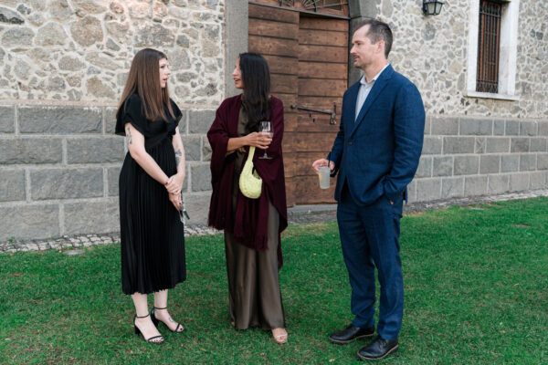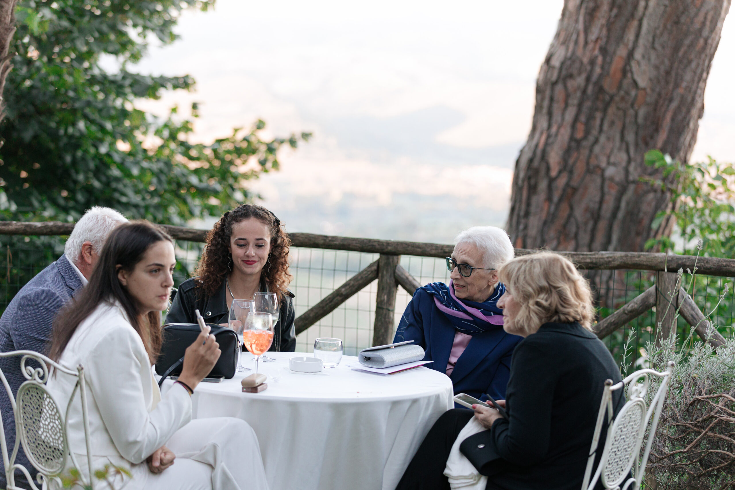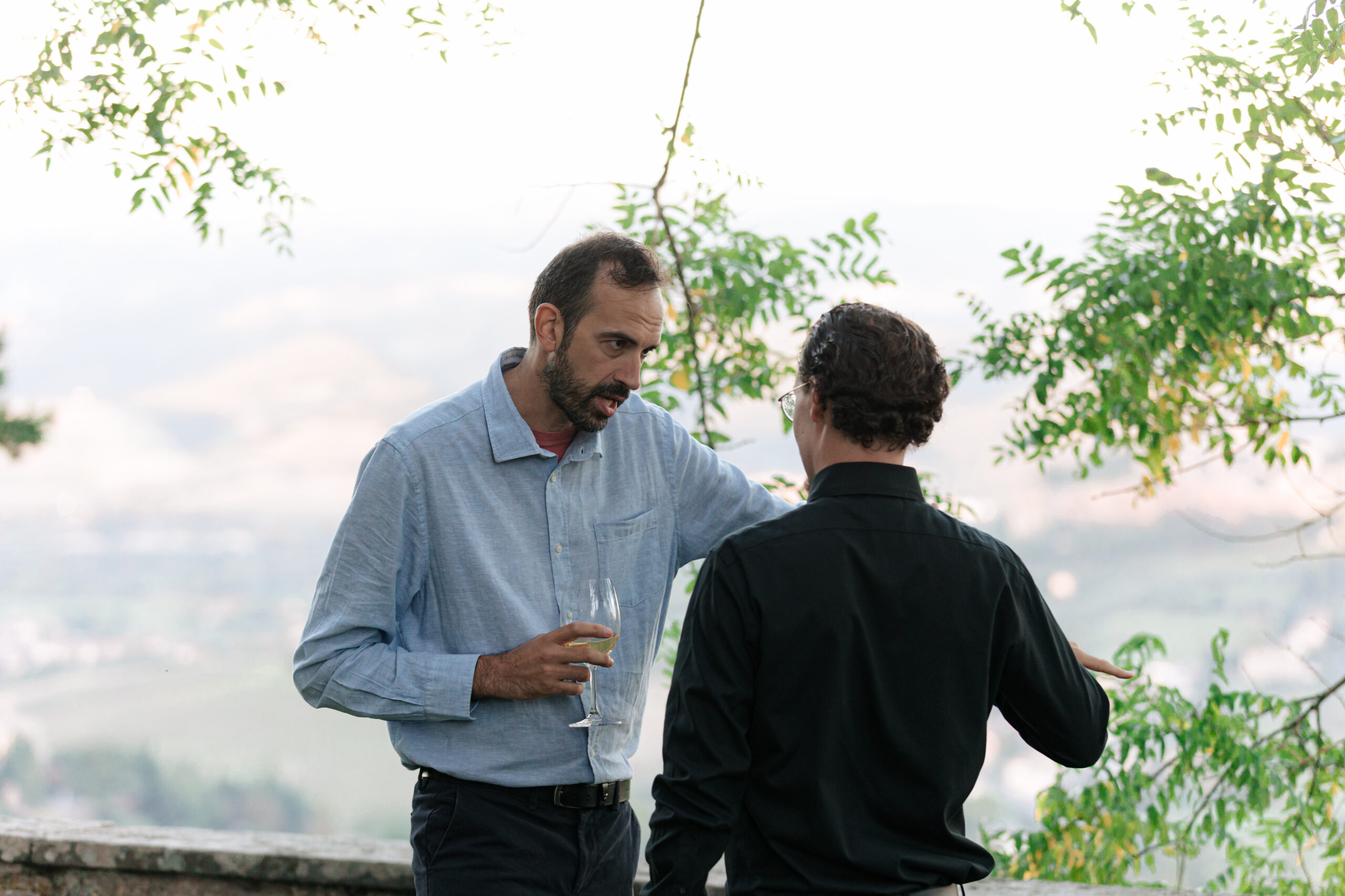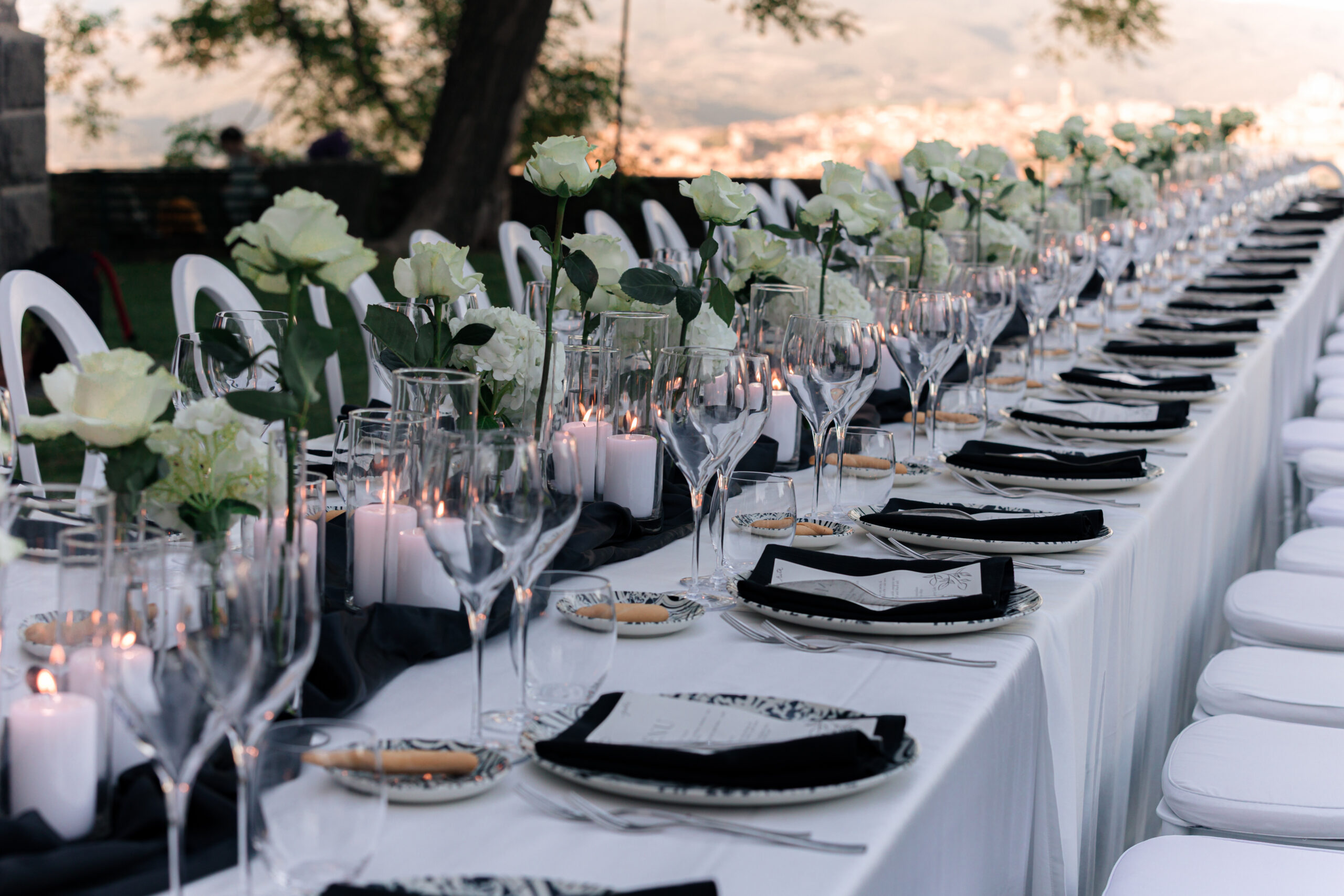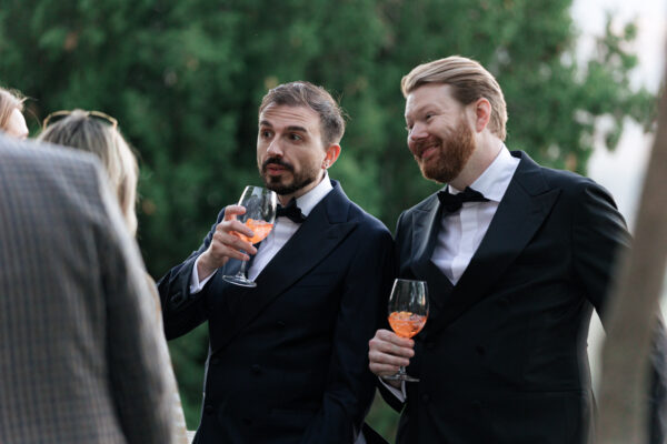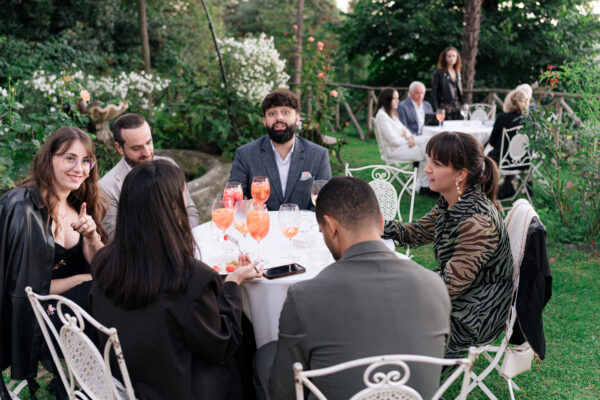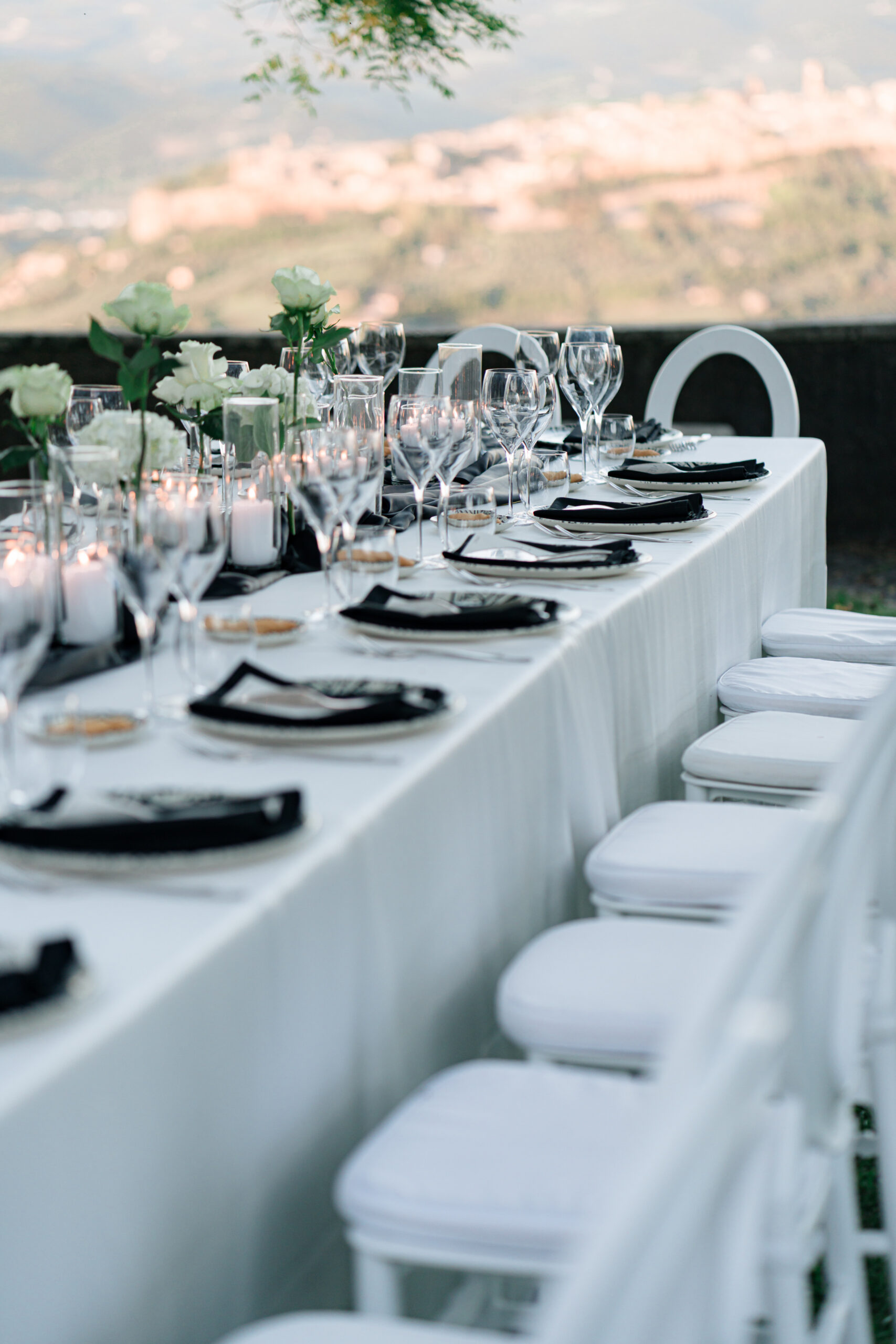 The ceremony was held outdoors beneath ancient trees, overlooking rolling landscapes that seemed to stretch endlessly. Guests enjoyed the scent of rosemary and lavender carried by a soft breeze, while the couple exchanged their vows in front of a panoramic view that only Umbria can offer.