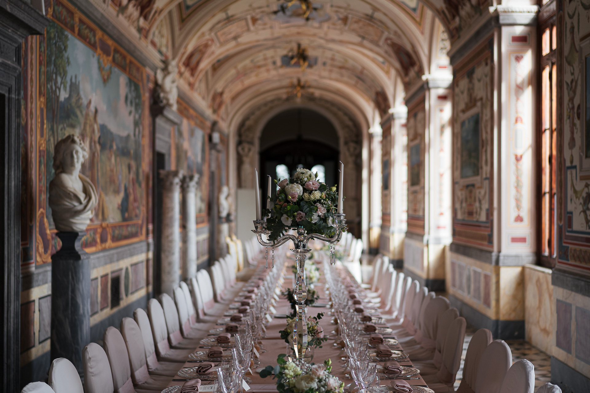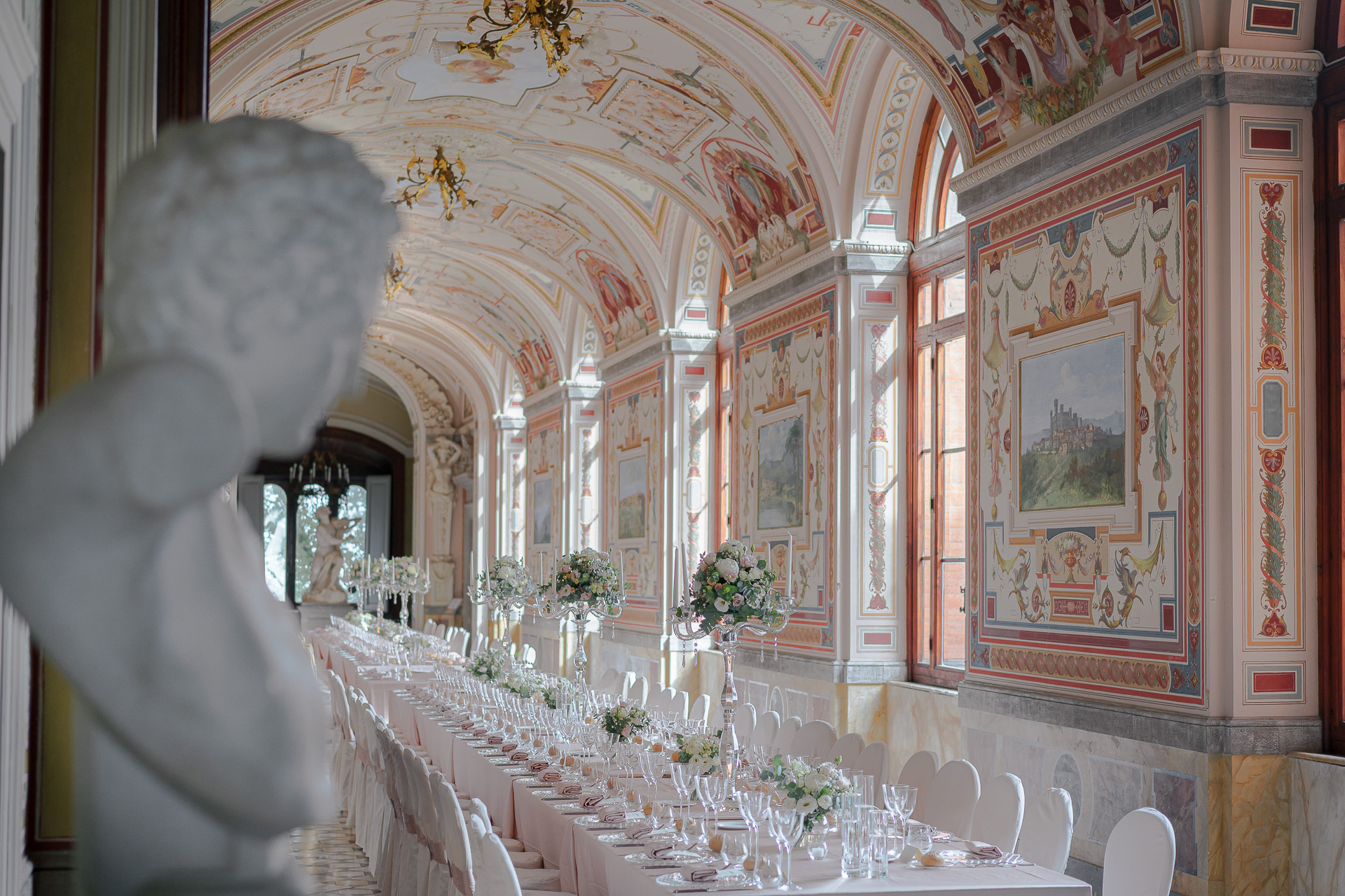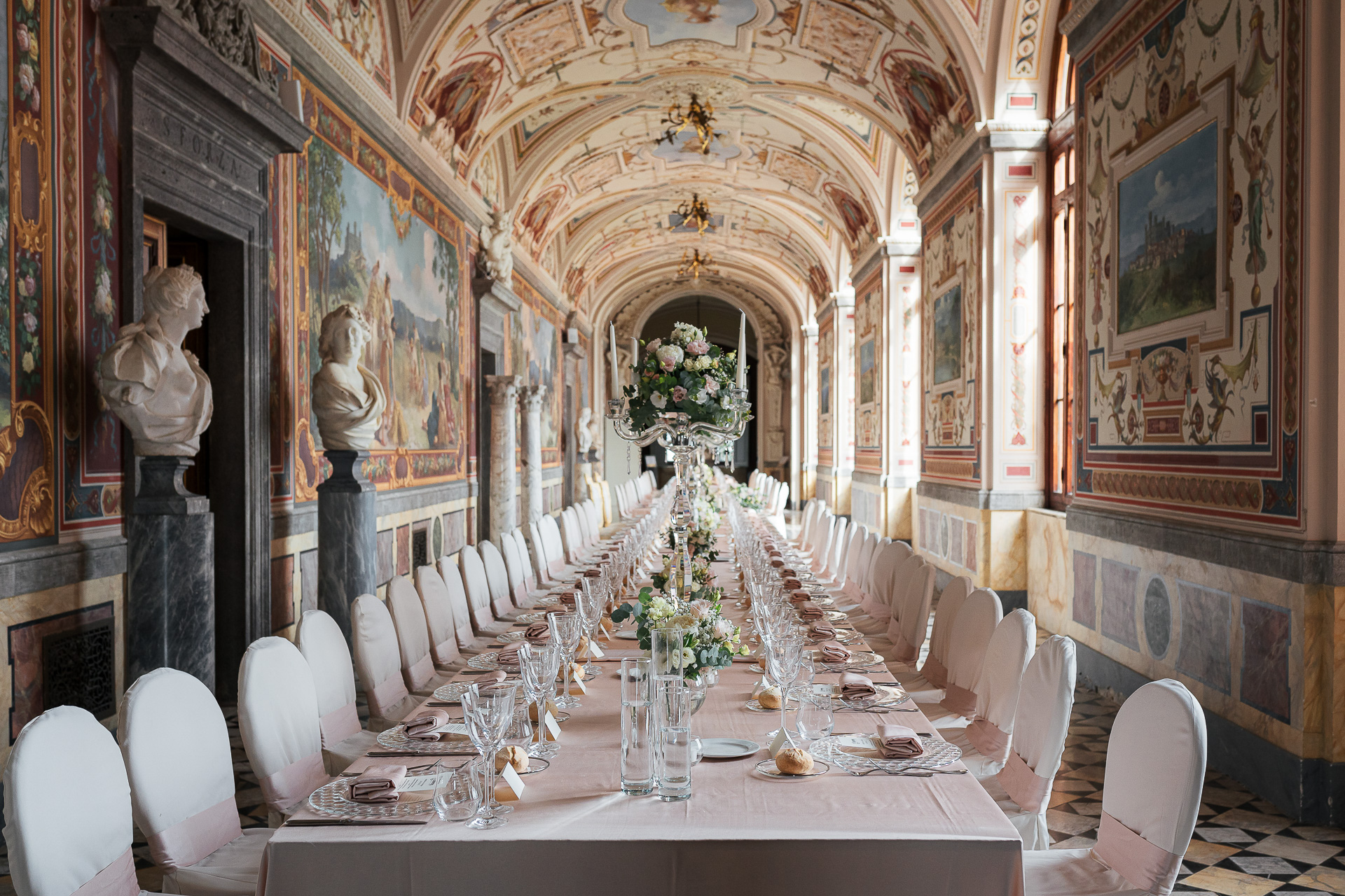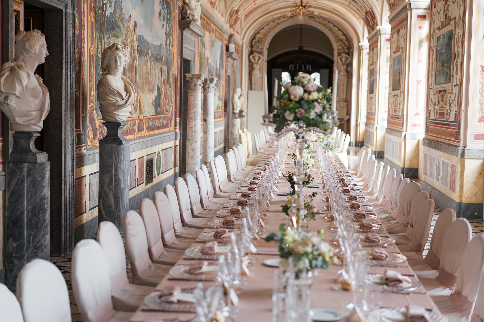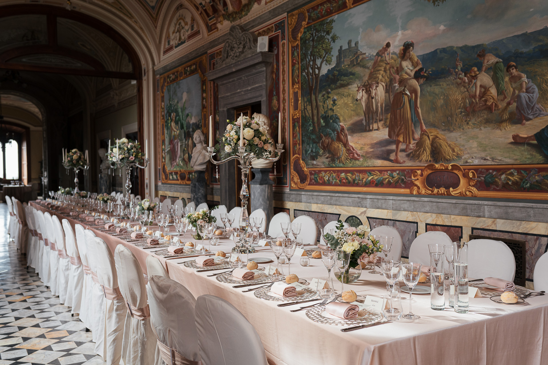 the dining room of the castle is entirely decorated with antique paintings and the imperial table is worthy of a luxury wedding.