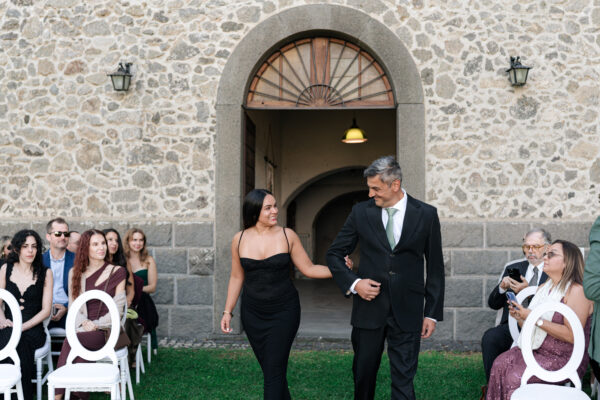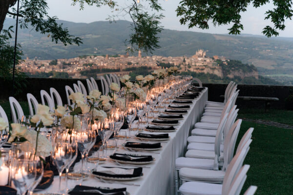The ceremony was held outdoors beneath ancient trees, overlooking rolling landscapes that seemed to stretch endlessly. Guests enjoyed the scent of rosemary and lavender carried by a soft breeze, while the couple exchanged their vows in front of a panoramic view that only Umbria can offer.