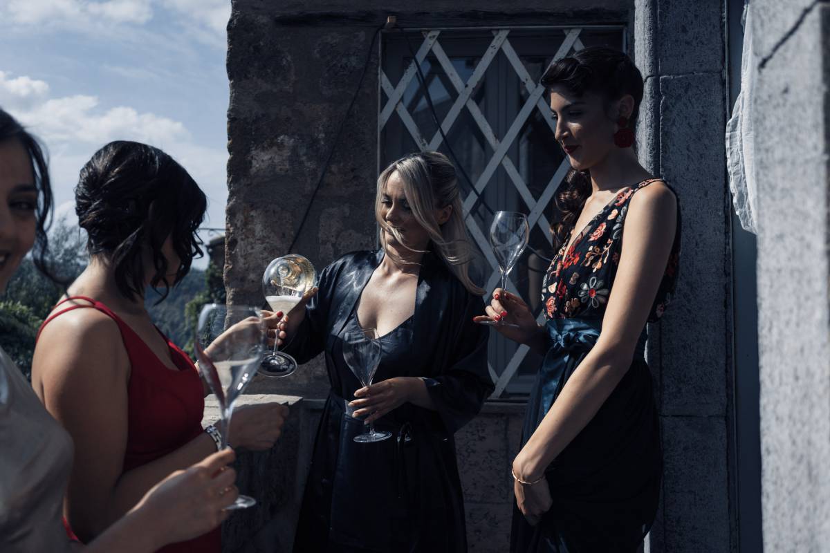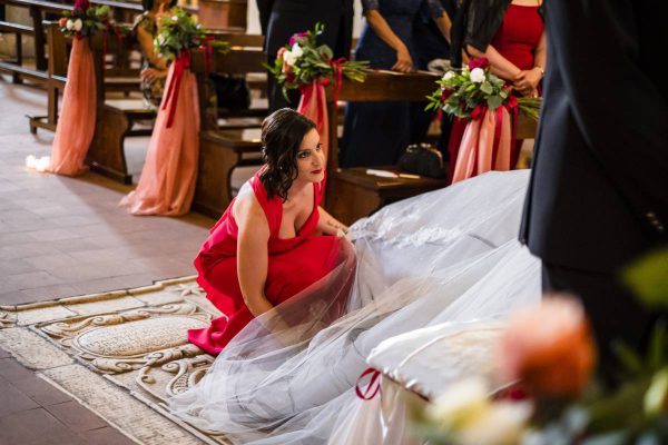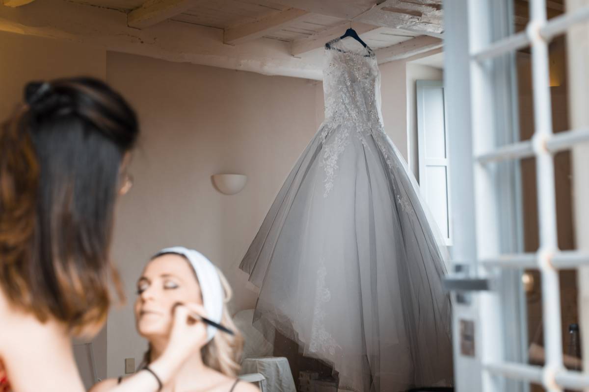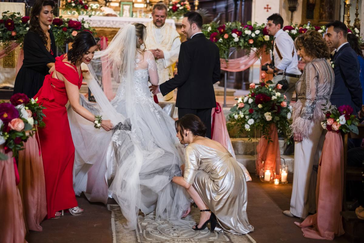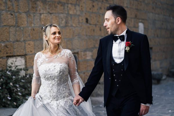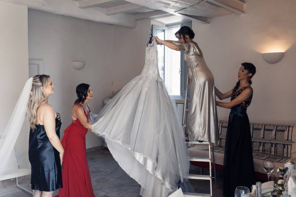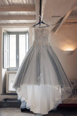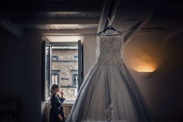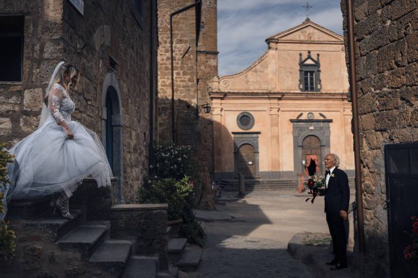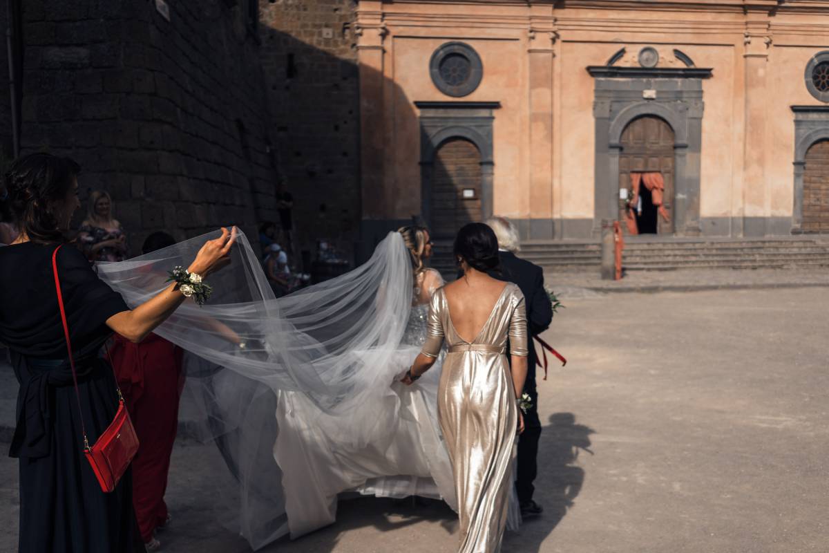 Con alle spalle la cornice naturale e malinconica della chiesa di S. Donato, nella piazza principale della magnifica Civita di Bagnoregio, la perfezione della giornata del matrimonio ha fatto sì che il resto venisse da sé. Il set per la vestizione, deciso di comune accordo, si dotava di pareti bianche, così che il meraviglioso vestito di Erika, dalle tonalità blu-grigiastre, potesse risaltare al massimo delle sue possibilità.