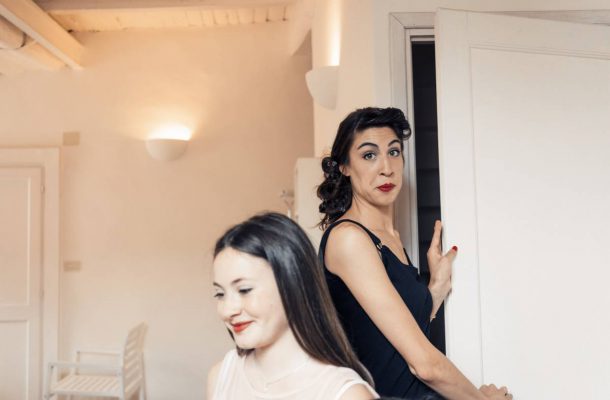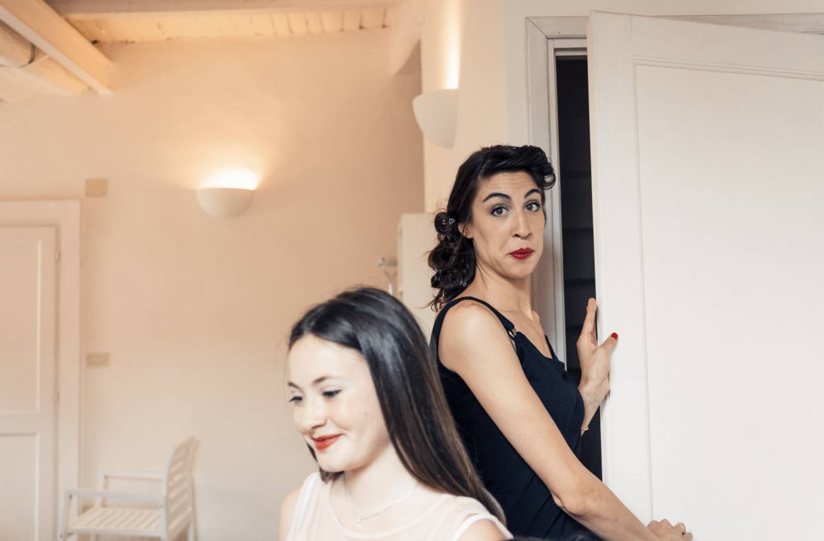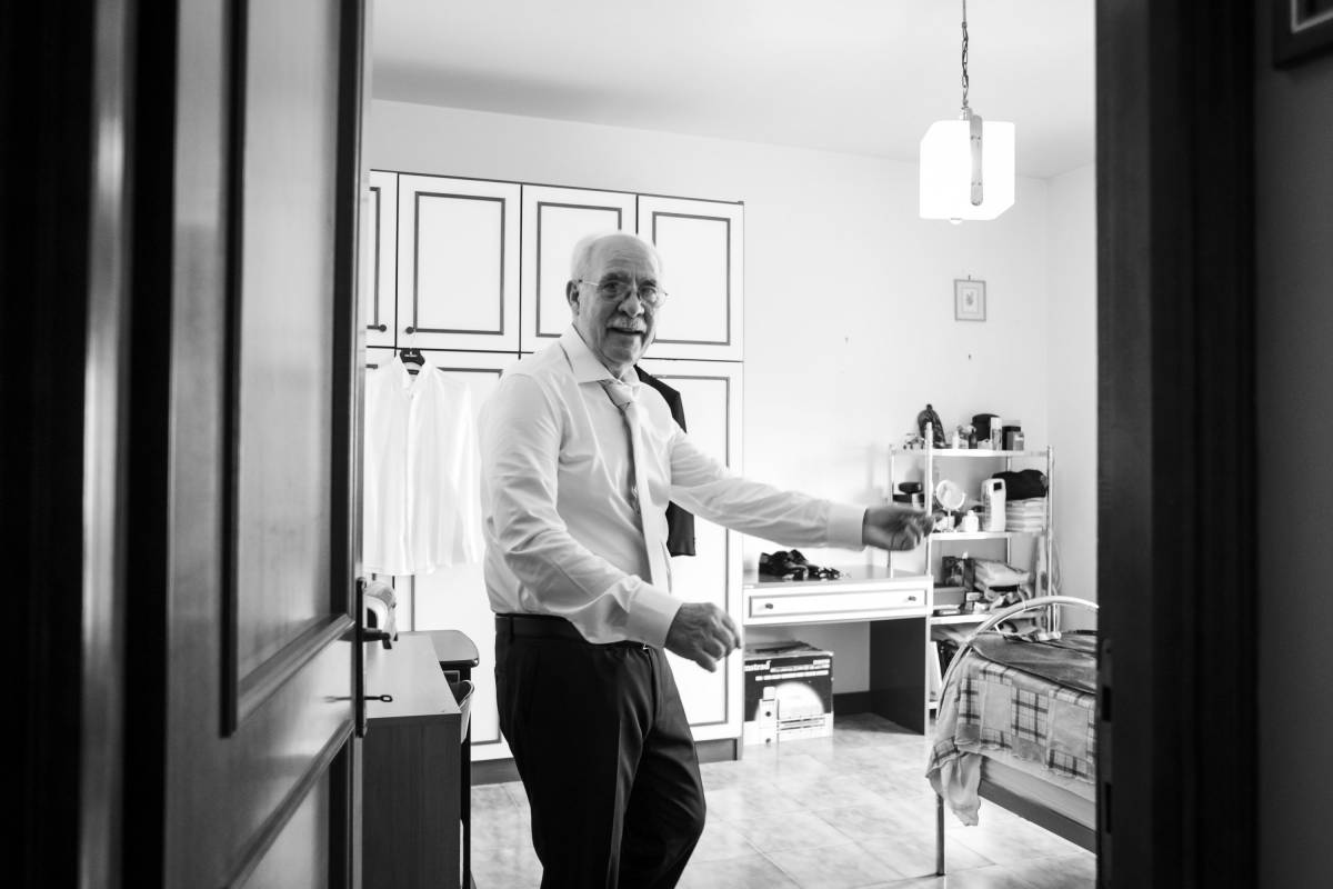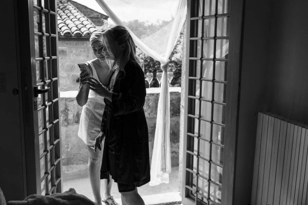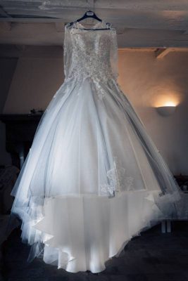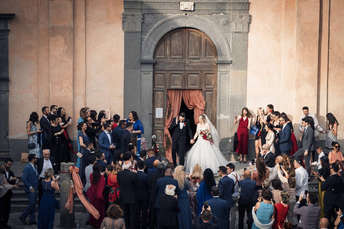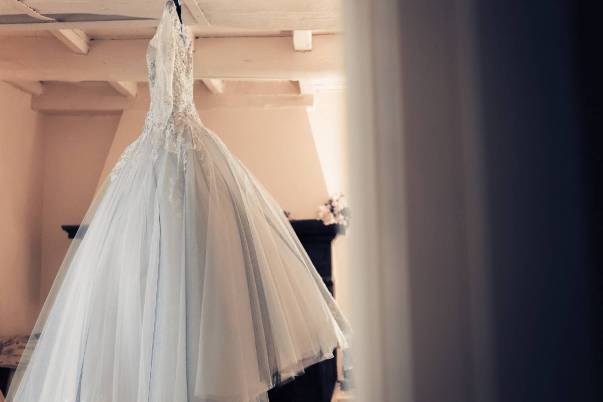 Con alle spalle la cornice naturale e malinconica della chiesa di S. Donato, nella piazza principale della magnifica Civita di Bagnoregio, la perfezione della giornata del matrimonio ha fatto sì che il resto venisse da sé. Il set per la vestizione, deciso di comune accordo, si dotava di pareti bianche, così che il meraviglioso vestito di Erika, dalle tonalità blu-grigiastre, potesse risaltare al massimo delle sue possibilità.