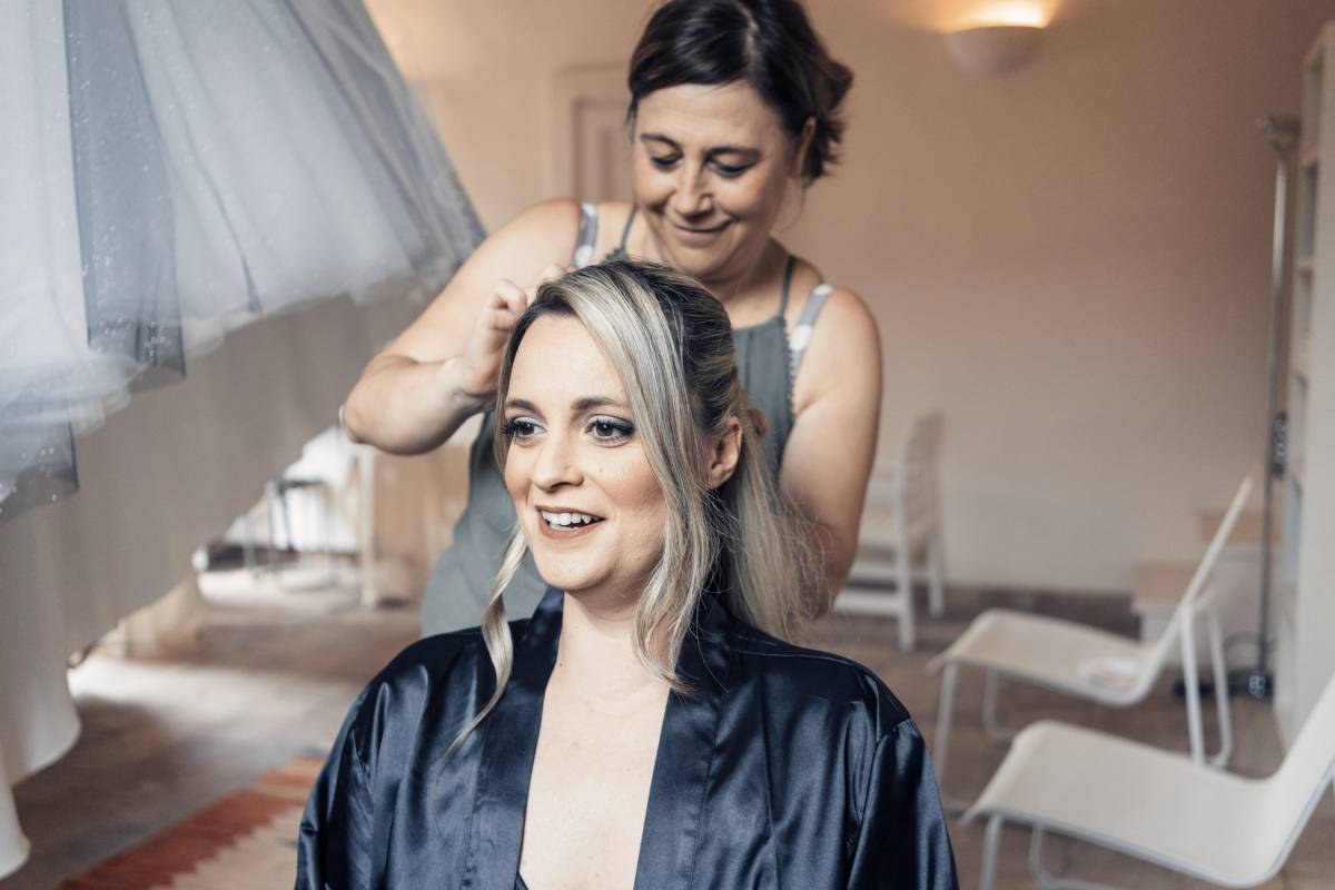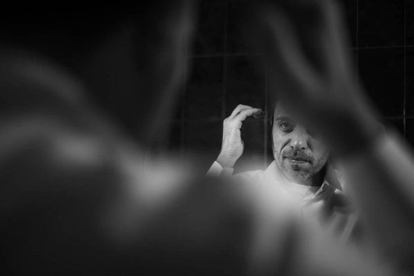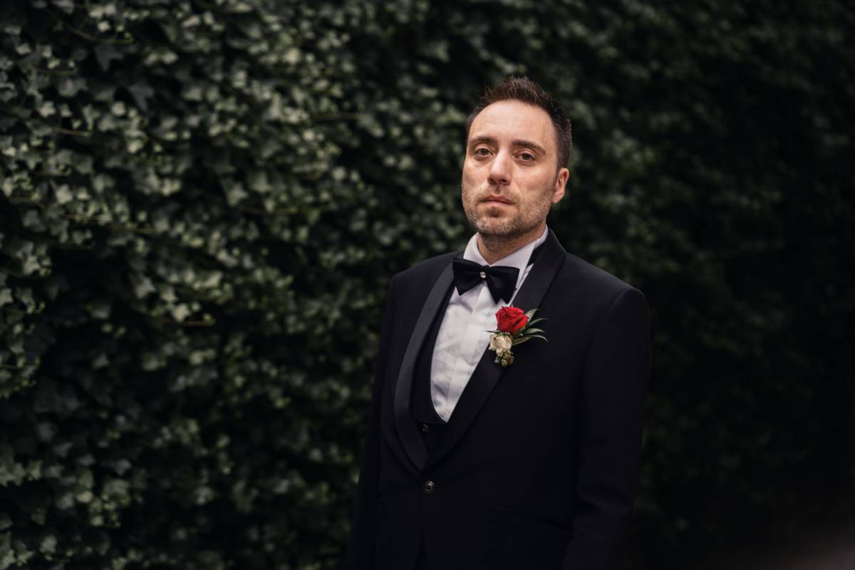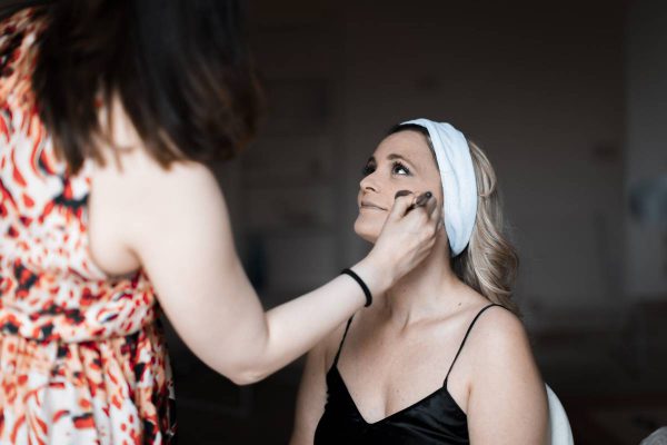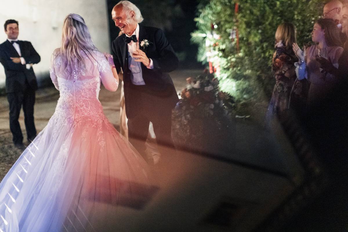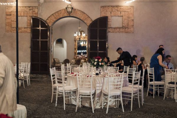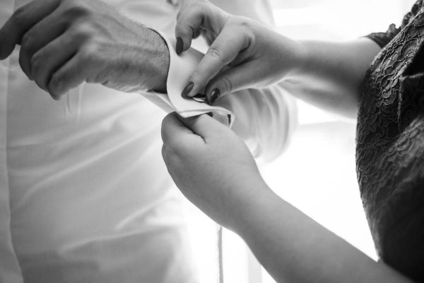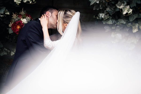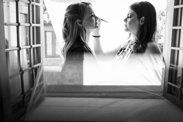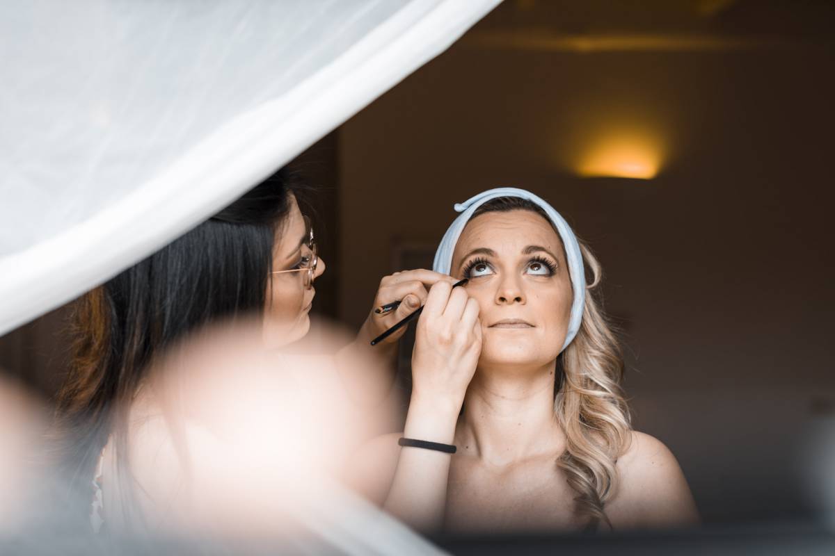 Con alle spalle la cornice naturale e malinconica della chiesa di S. Donato, nella piazza principale della magnifica Civita di Bagnoregio, la perfezione della giornata del matrimonio ha fatto sì che il resto venisse da sé. Il set per la vestizione, deciso di comune accordo, si dotava di pareti bianche, così che il meraviglioso vestito di Erika, dalle tonalità blu-grigiastre, potesse risaltare al massimo delle sue possibilità.