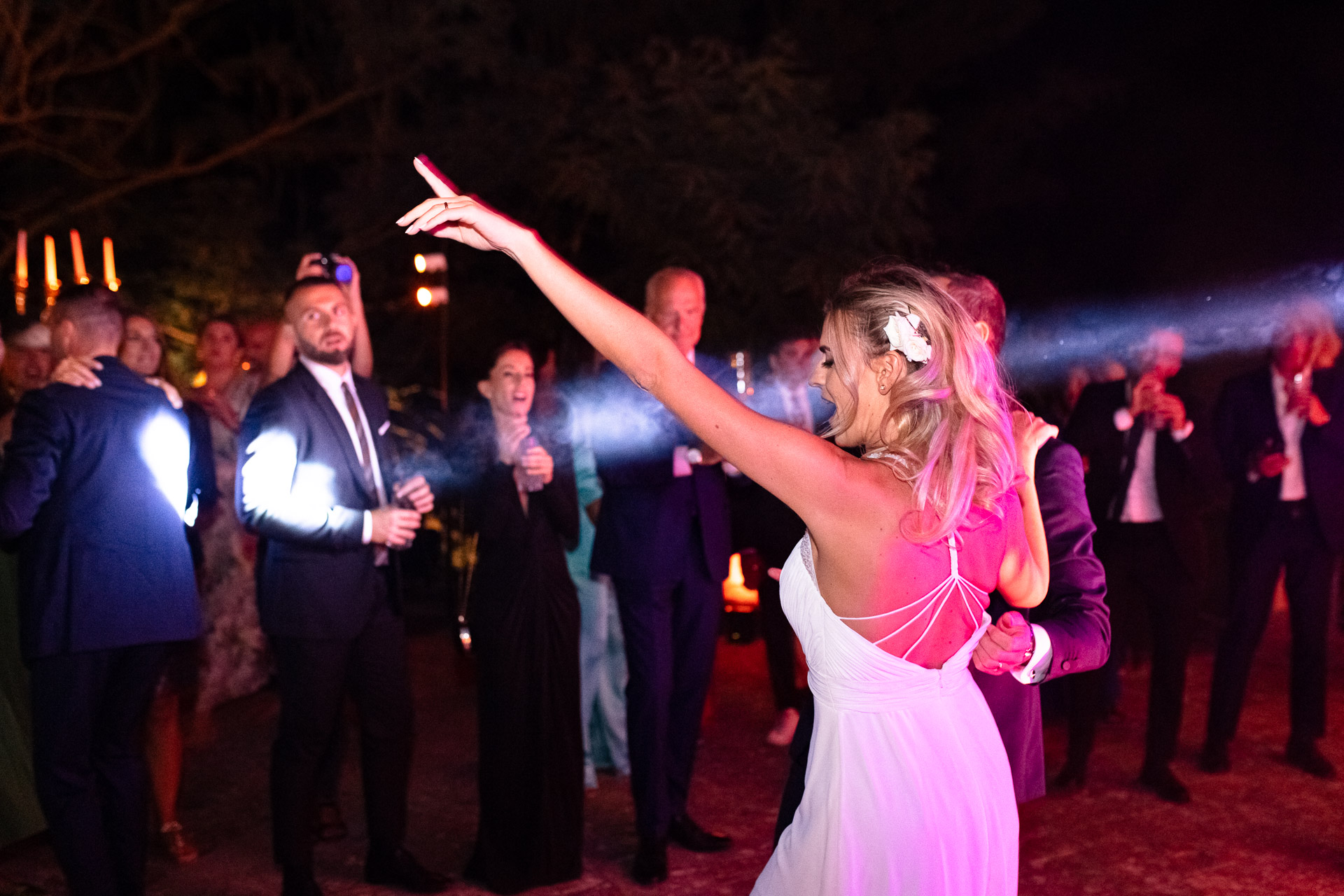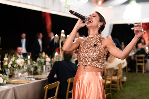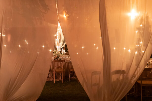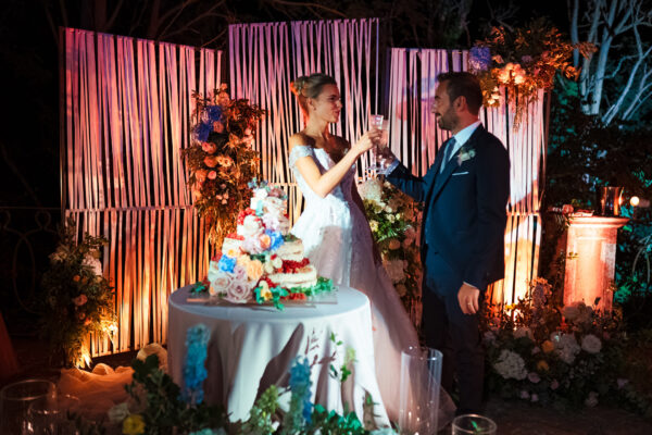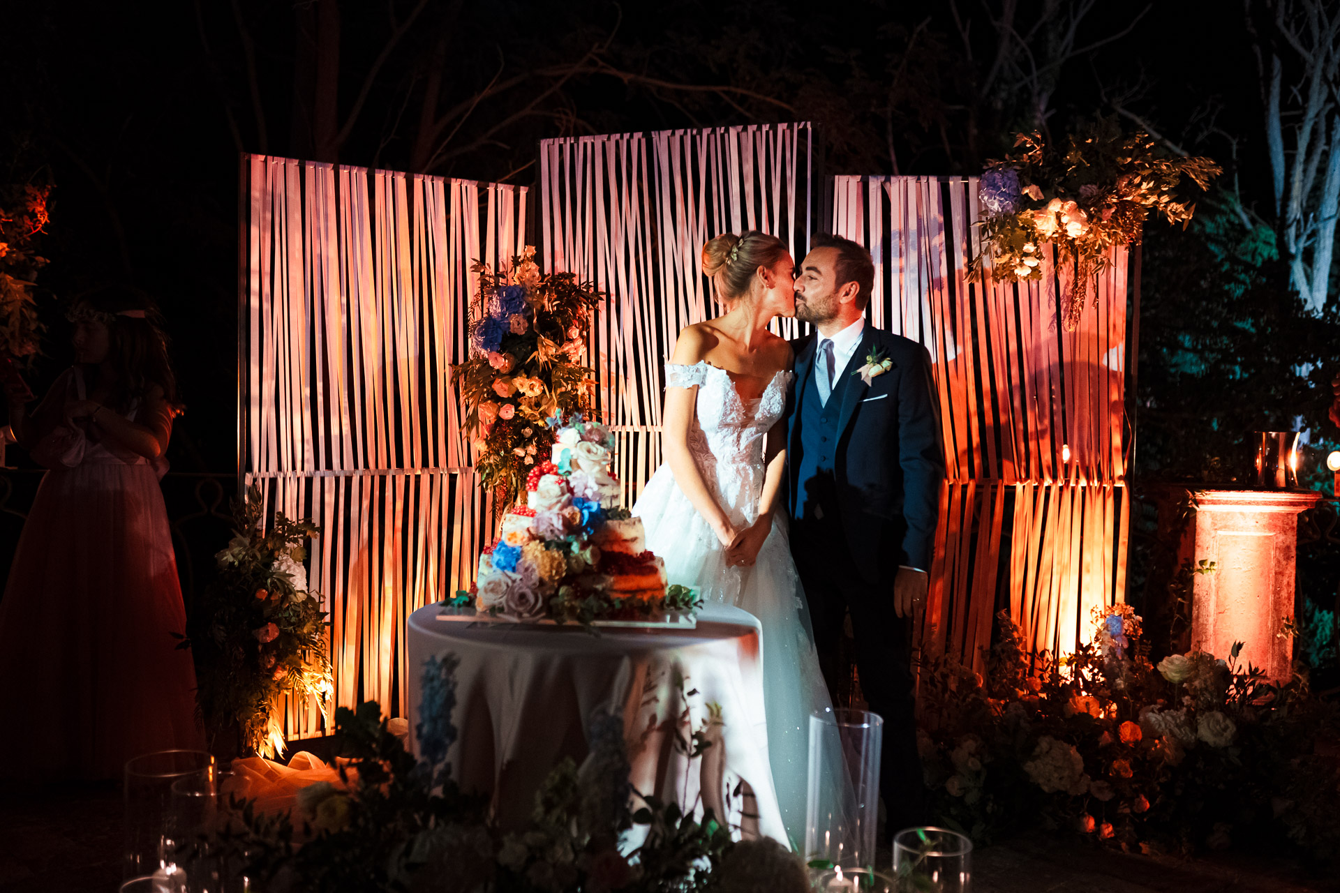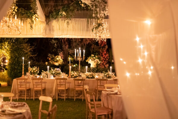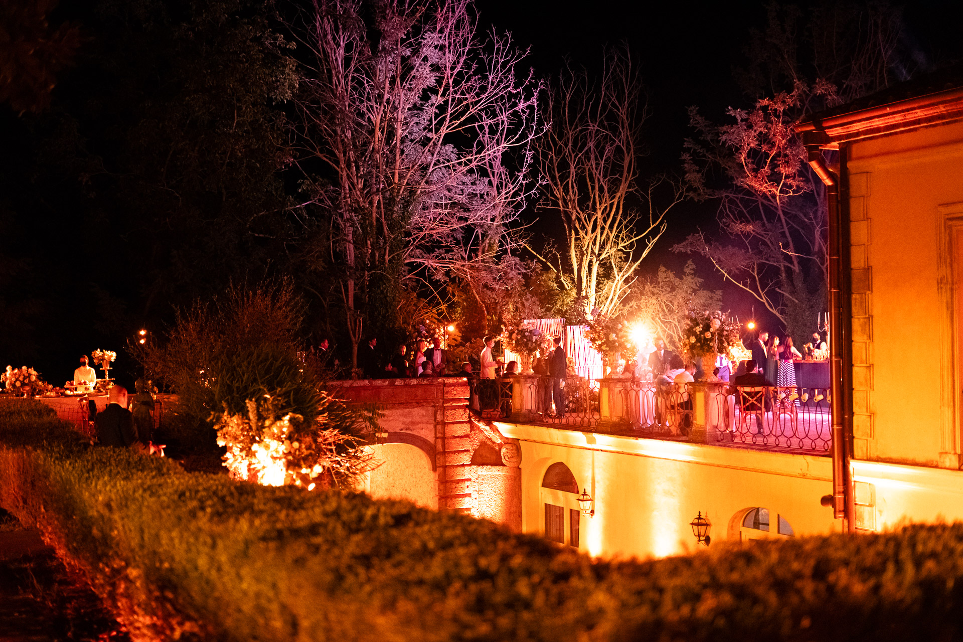 Daniela di Enoteca la Torre ha realizzato gli allestimenti per la cena, nel grande giardino insieme a Romina di Sartoria Floreale, con la magia di luci di Roma Sound Service.
