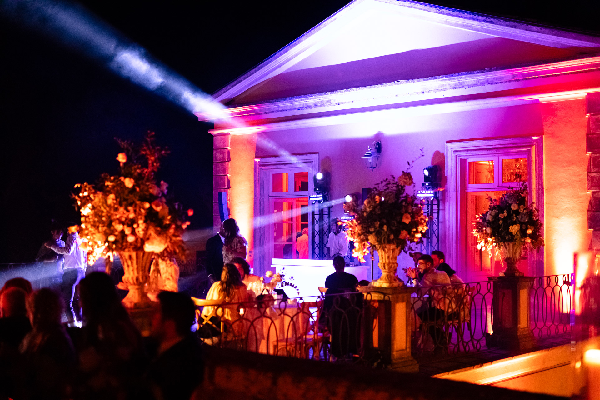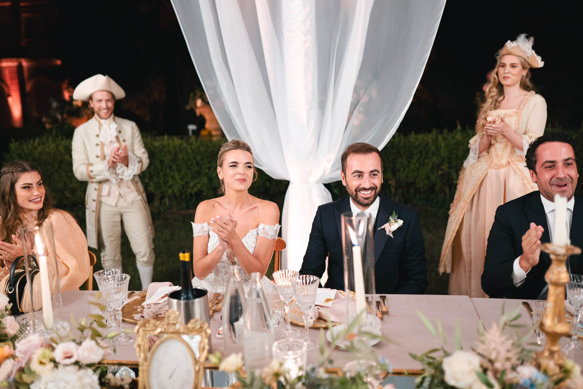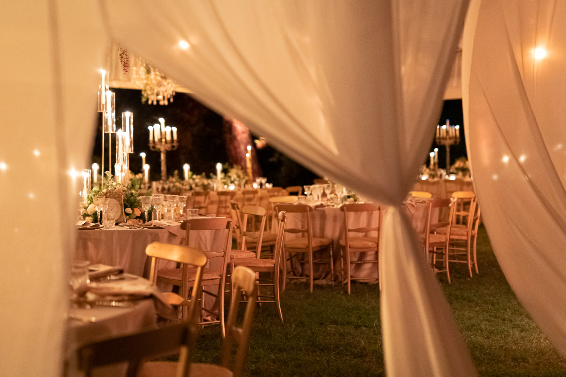 La Location a Palazzo Monaldeschi poco distante da Civita di Bagnoregio, era tutto perfetto, una fiaba in stile parisienne, un atmosfera unica, grazie al lavoro impeccabile di Enoteca LaTorre, Sartoria Floreale i concept musicali e le luci architetturali di Roma Sound Service hanno reso magico questo matrimonio, la Sala per la Cena, i tavoli imperiali, I figuranti, i lampadari, le candele, la “mise en place”, stupenda hanno fatto il resto.