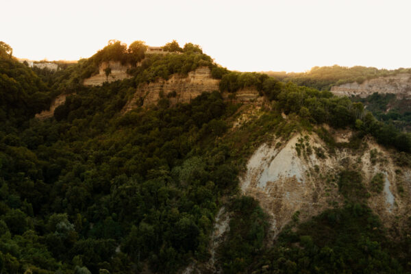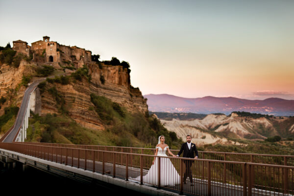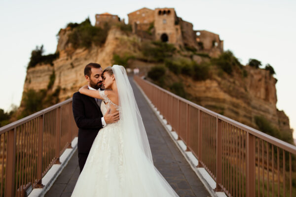 V&F si son lasciati indirizzare, da noi, fotografi e videomaker, ci son state risate e momenti molto intimi, poi abbiamo iniziato a scendere dal ponte di Civita di Bagnoregio, lì, alle prime scale, il sole si incanala d’estate regalando alla porta maestosa di Civita gli ultimi raggi. Sapevo che ci sarebbe stato un tramonto stupendo e ho giocato con le luci, con bellissimi “flare”, ho lasciato entrare la luce nell’obiettivo, donando cromie arancioni su i loro volti. Poi nell’ultima foto sul ponte di Civita, i calanchi ed il cielo assieme allorizzonte, assumono tonalità violacee, arancio e verdognole, l’ ho scelta come immagine di copertina.