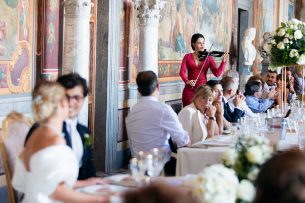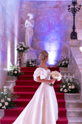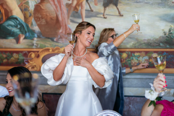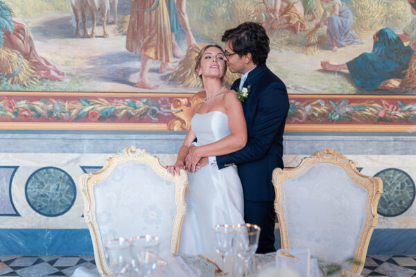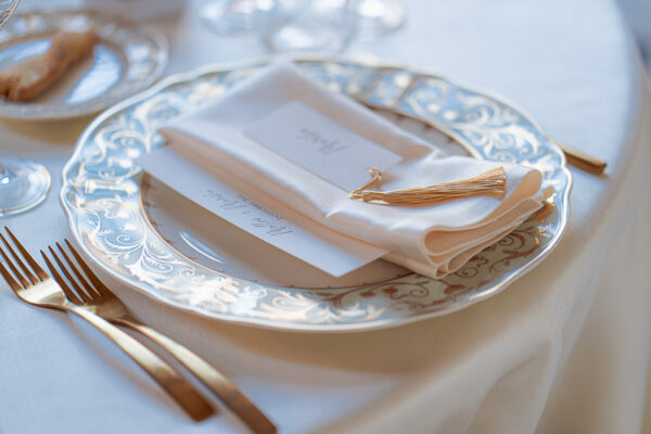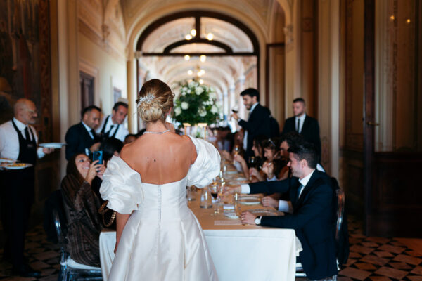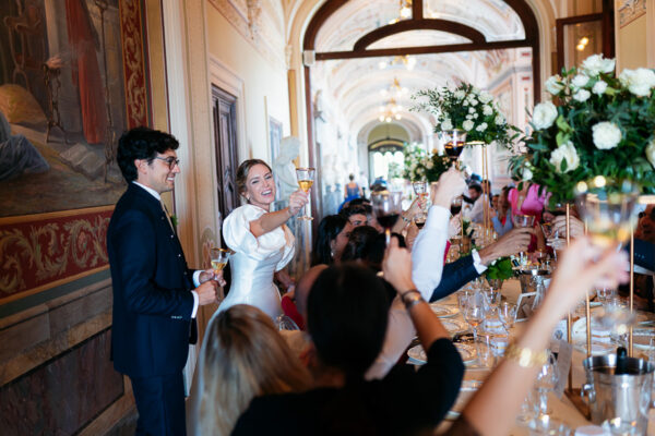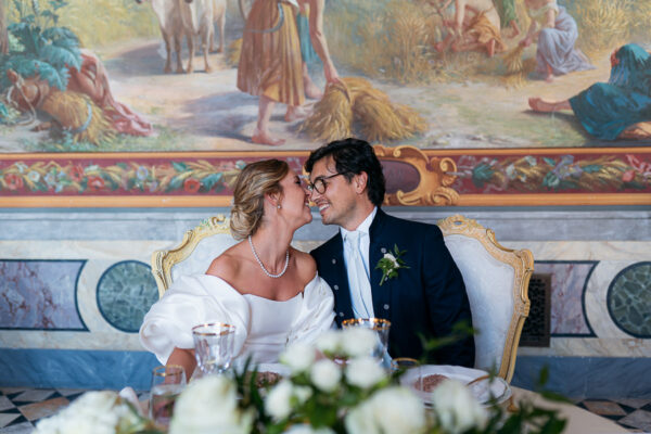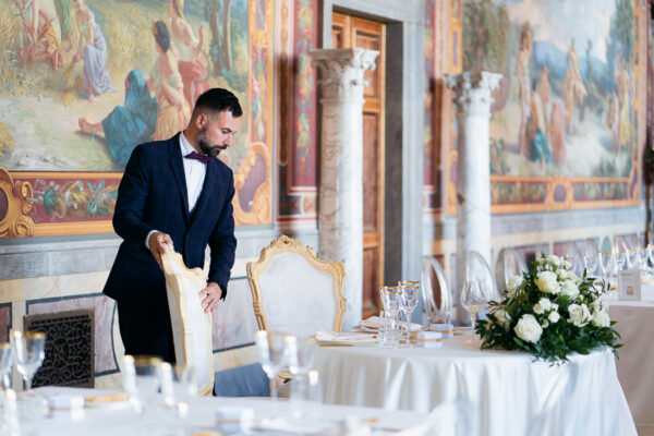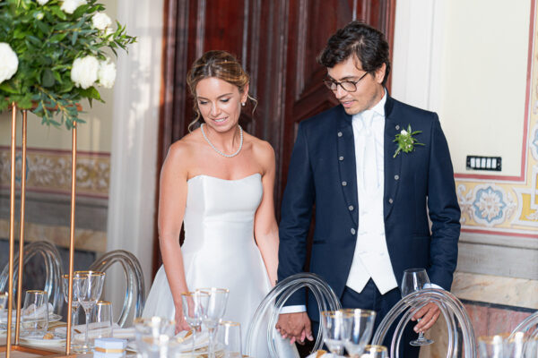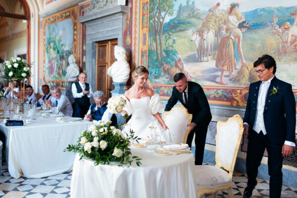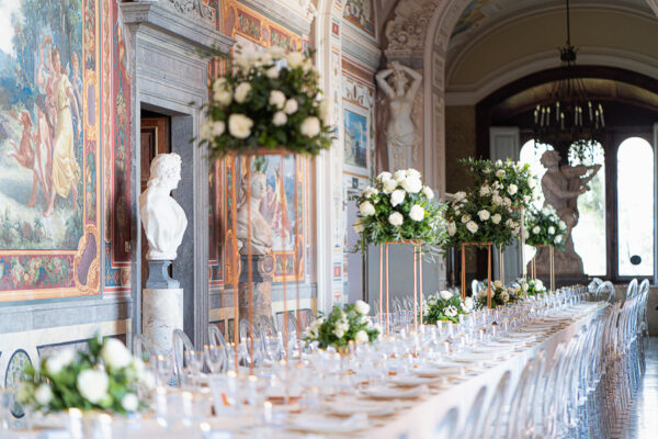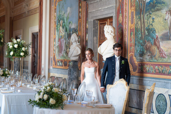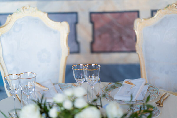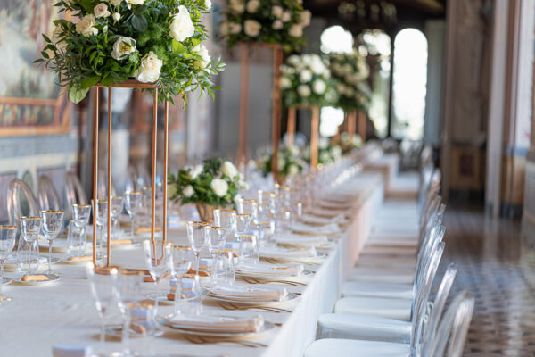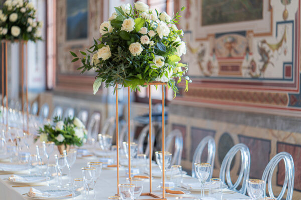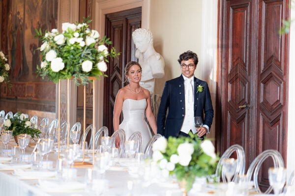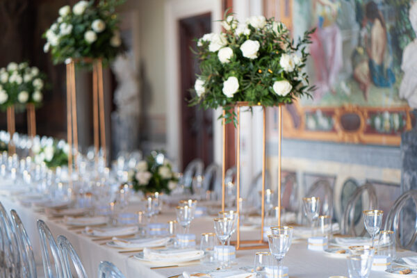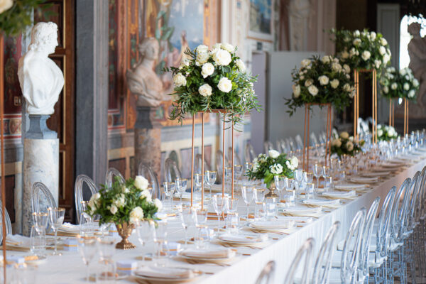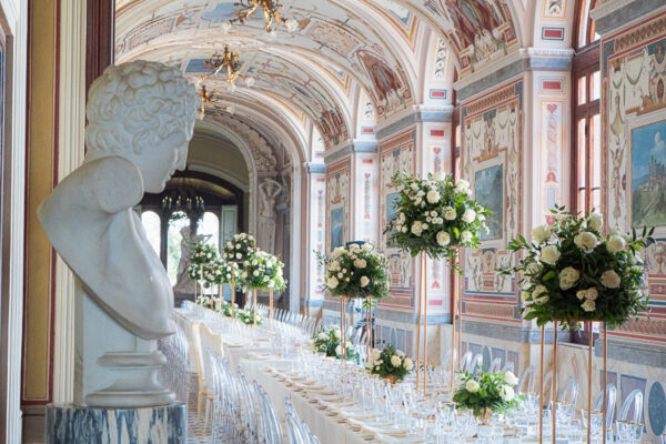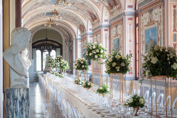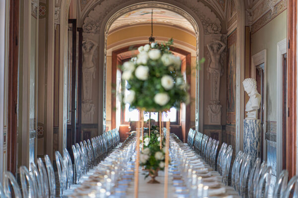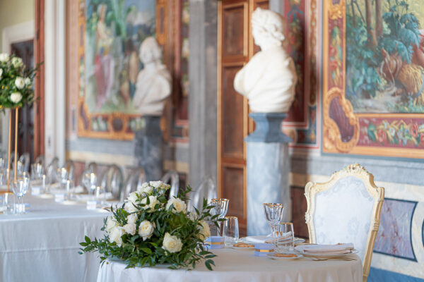 Quella che ci guida attraverso matrimoni fatti di eleganza, spesso anche di formalità cerimoniale e di accoglienza di alto lignaggio. Tessuti semplici ma pregiati, da ritrovare nei tovagliati; posateria raffinata, porcellane e cristalli nella mise en place di una tavola imperiale che si snoda lungo le linee di fuga delle grandi gallerie del piano terra e del primo piano.