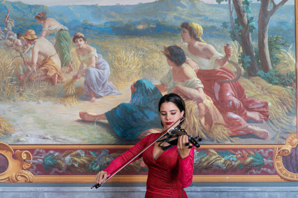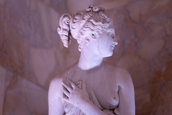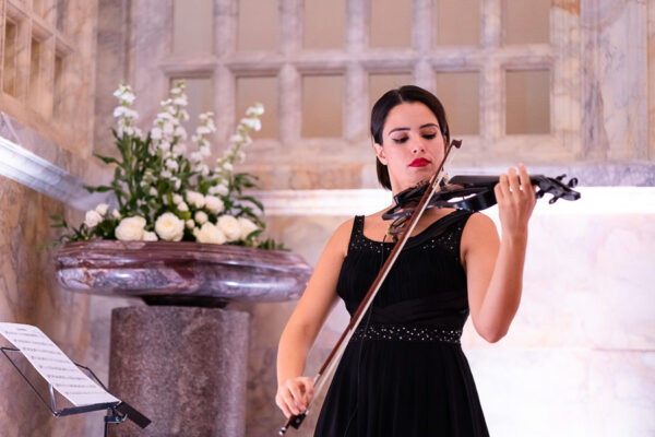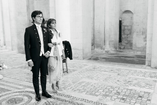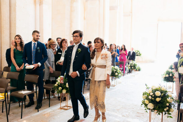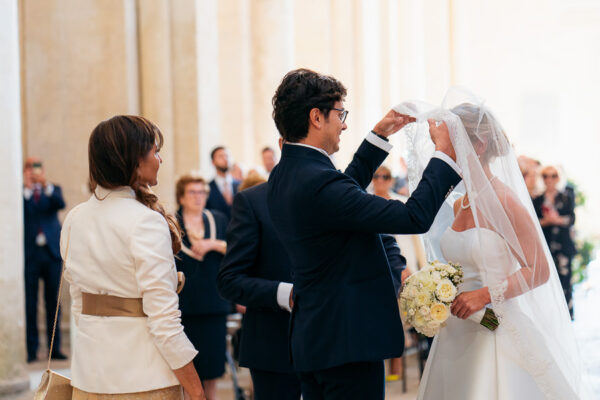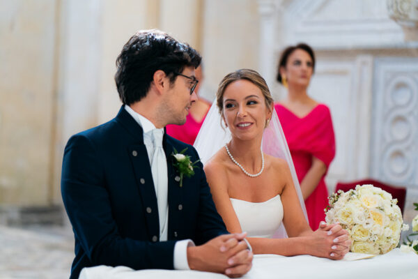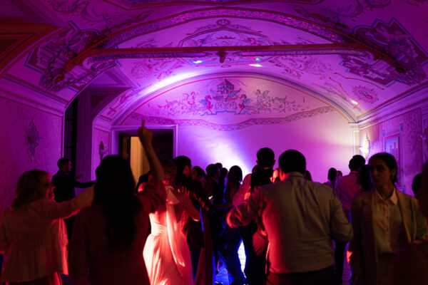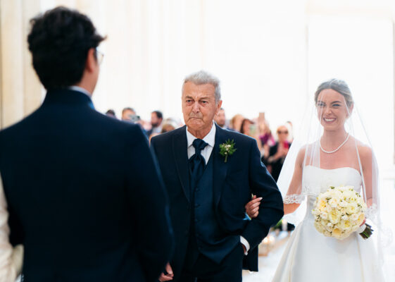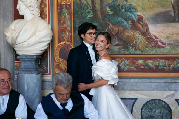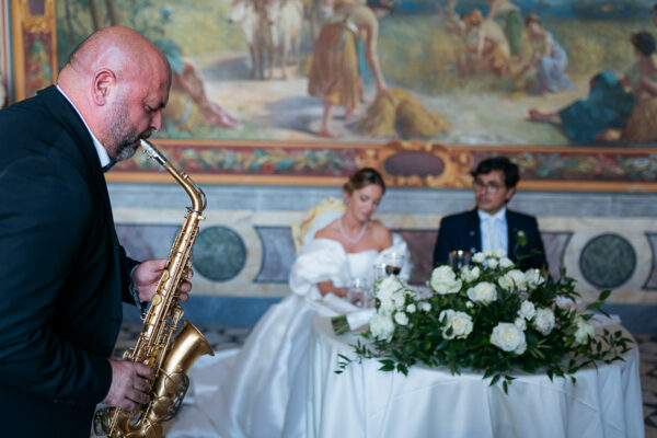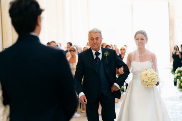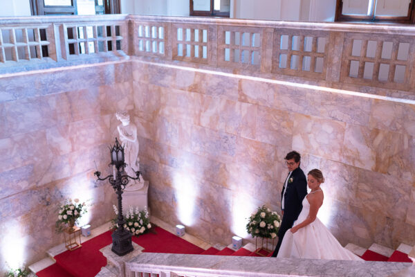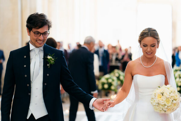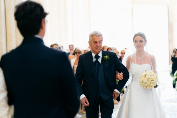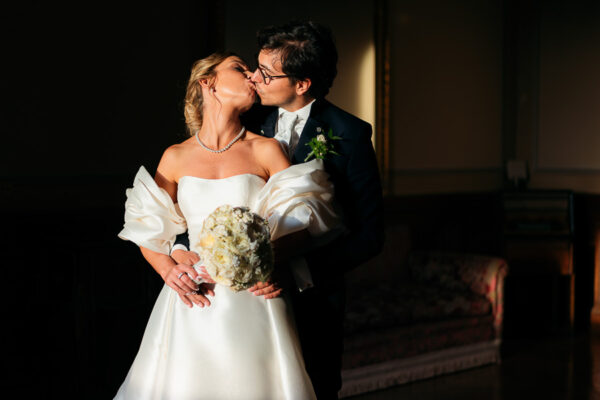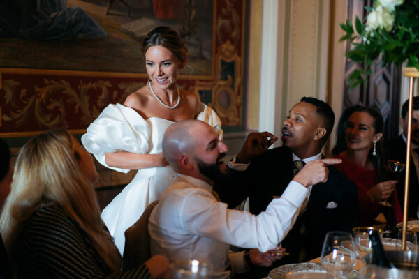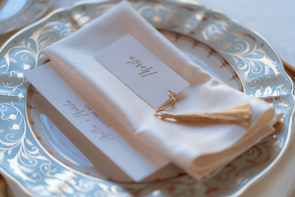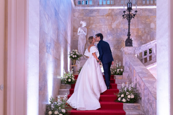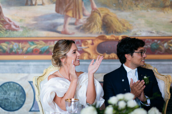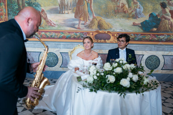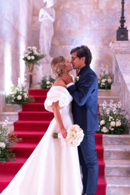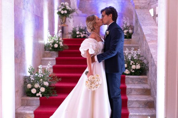 Quella che ci guida attraverso matrimoni fatti di eleganza, spesso anche di formalità cerimoniale e di accoglienza di alto lignaggio. Tessuti semplici ma pregiati, da ritrovare nei tovagliati; posateria raffinata, porcellane e cristalli nella mise en place di una tavola imperiale che si snoda lungo le linee di fuga delle grandi gallerie del piano terra e del primo piano.