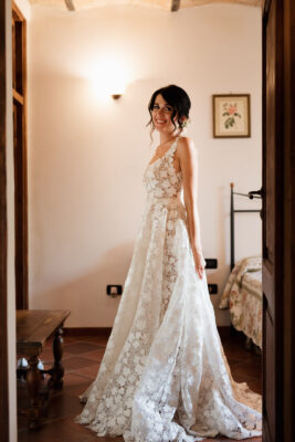 C. è un’ amica di vecchia data, ci conosciamo dalle elementari, ho cercato quindi di ispirarmi maggiormente al suo carattere e ho scelto colori, pastello, per dare risalto alla semplicità di C. ed al suo vestito “particolare” e così Suo, una scelta azzeccatissima, appena l ho visto, ho esclamato, che vestito da “Cami “!!. A me è piaciuto moltissimo, così come la scelta di non mettere il velo. 😉
