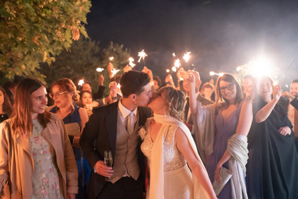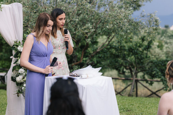 Le vestizioni si sono svolte nelle stanze del castello assieme al loro cagnolino. La bellissima cerimonia del rito del matrimonio si è svolta nel prato con alle spalle la fortezza alta  che creava davvero un scenario stupendo tra le mille emozioni da parte di tutti mentre si alternavano discorsi degli invitati e promesse degli sposi.